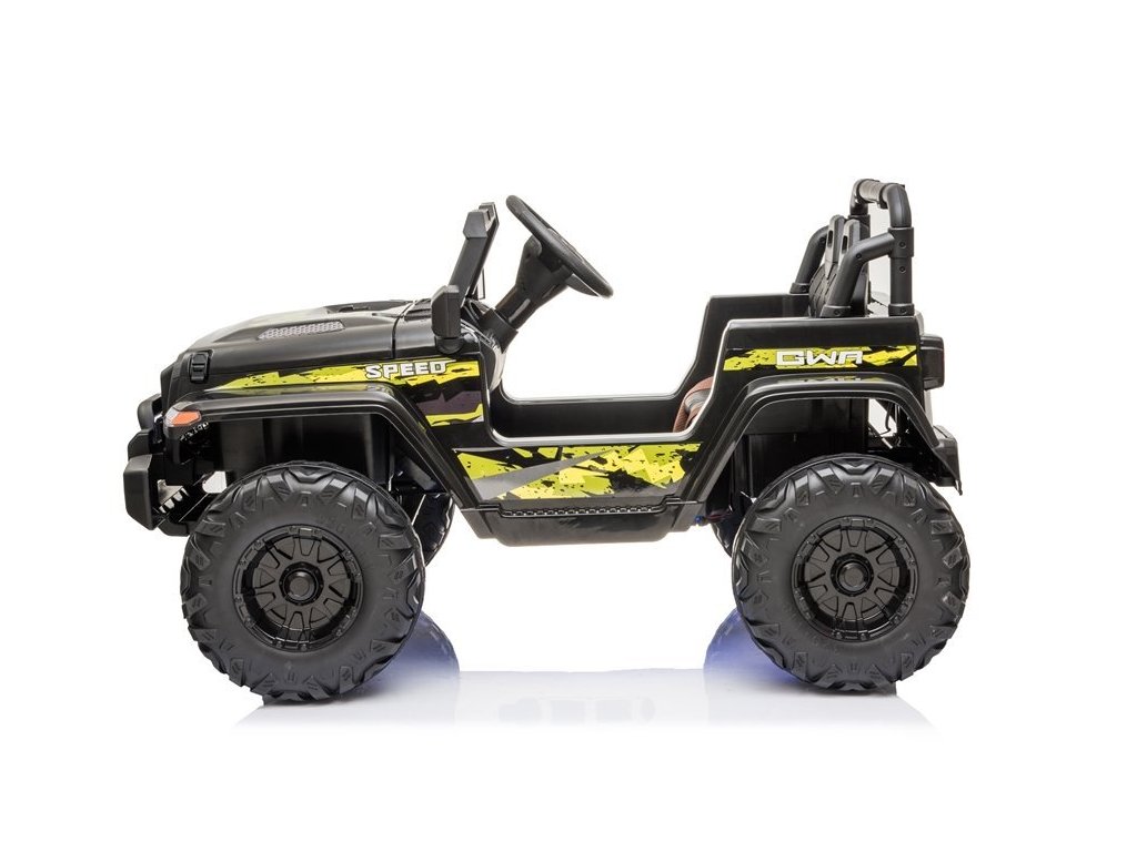 Gyermek elektromos Jeep Speed autó a terepjárók szerelmeseinek. A puha ökológiai bőrből készült kényelmes ülésben minden 25 kg teherbírású gyermek ülhet. Az Eva habkerekek csendesek, és nem csak az edzett felületekhez alkalmazkodnak. 5,5 km/h körüli sebességgel megy a terepen.