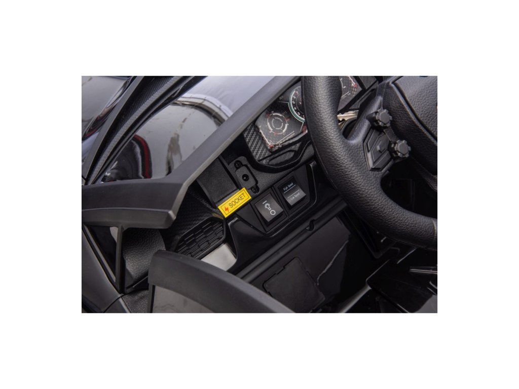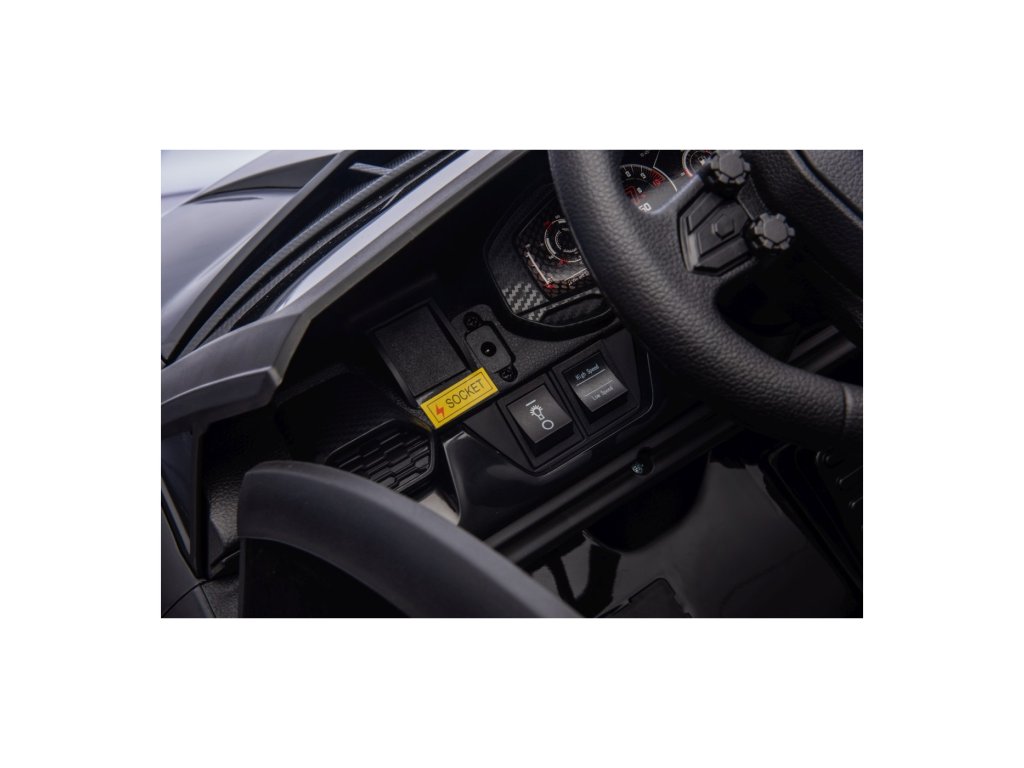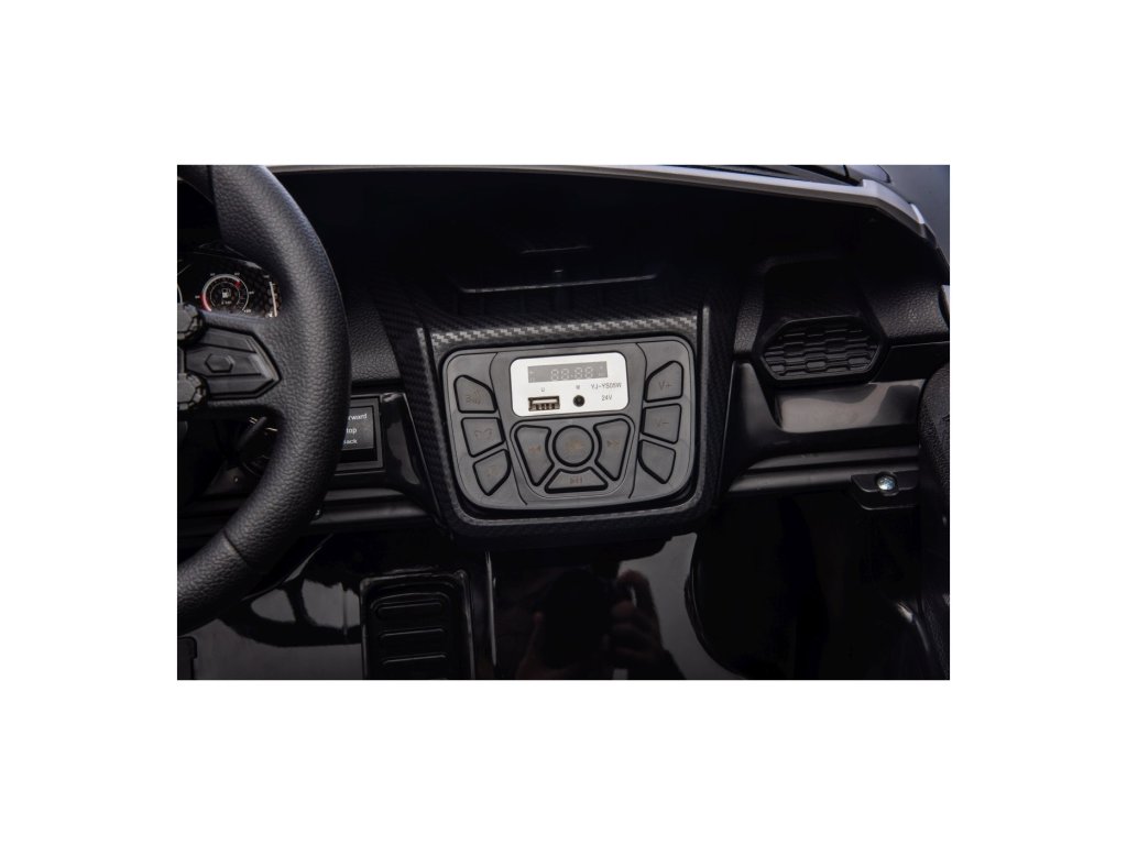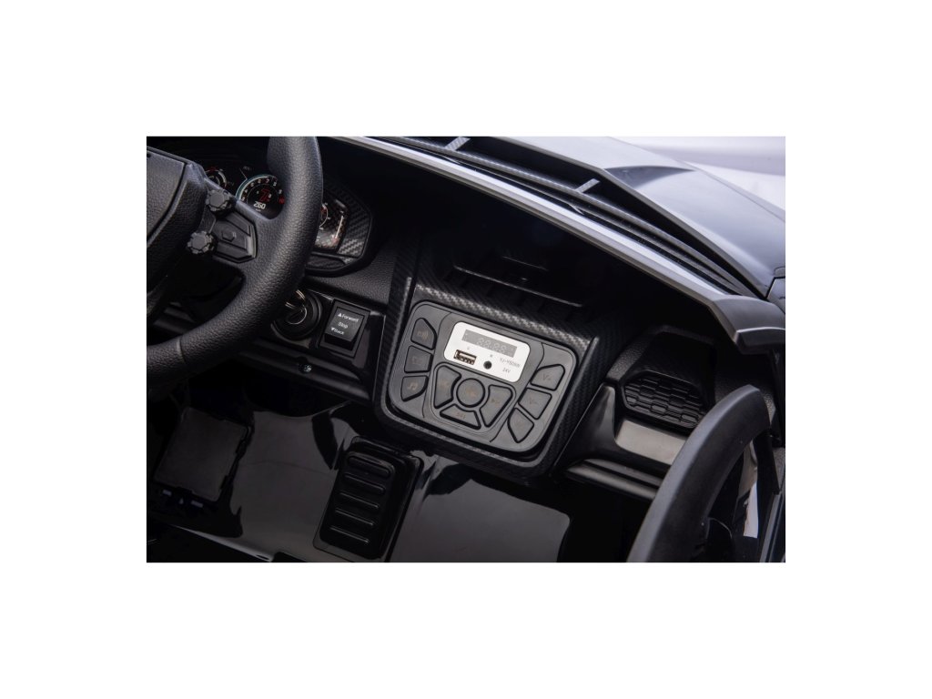 A gyermek élvezni fogja az utazást a zenepanelnek köszönhetően, amely FM rádiót, MP3-at, AUX bemenetet, Bluetooth- és USB-portot , valamint előre felvett dallamokat tartalmaz. A vezetési biztonságról a biztonsági övek és a sima indítás gondoskodik.