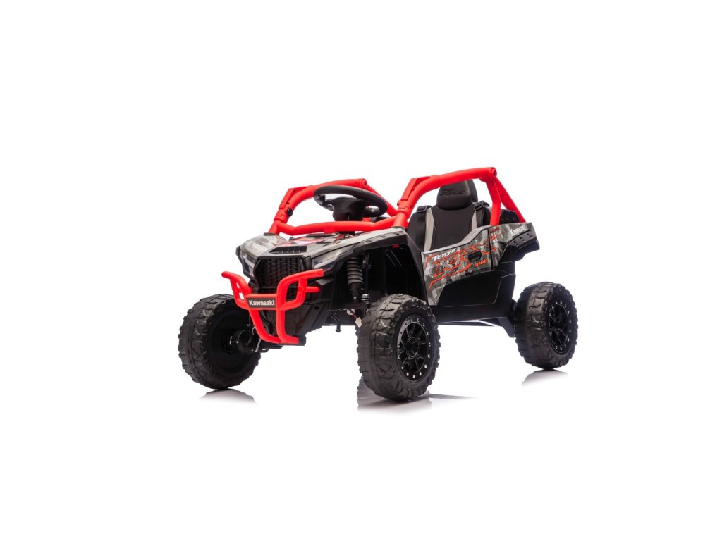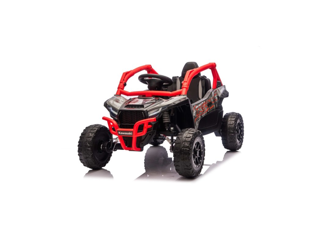 Stílusos Buggy Kawasaki TERYX KRX1000 gyerek kisautó ideális választás kis sofőrök számára, akik imádnak terepen és sima felületen is száguldozni. A nagy teljesítményű 24V-os rendszer négy motorral (2× 20W elöl, 2× 45W hátul) elegendő erőt biztosít még az egyenetlen terepen is. A kisautó puha EVA kerekekkel, kényelmes bőr üléssel és biztonsági övekkel van felszerelve. A STOP funkcióval ellátott távirányítónak köszönhetően a szülők mindig kézben tarthatják a járművet. A felszereltség tartalmaz LED lámpákat, audio panelt Bluetooth-szal, MP3, USB bemenettel és további funkciókkal.