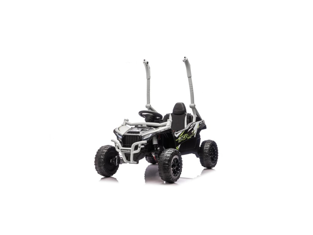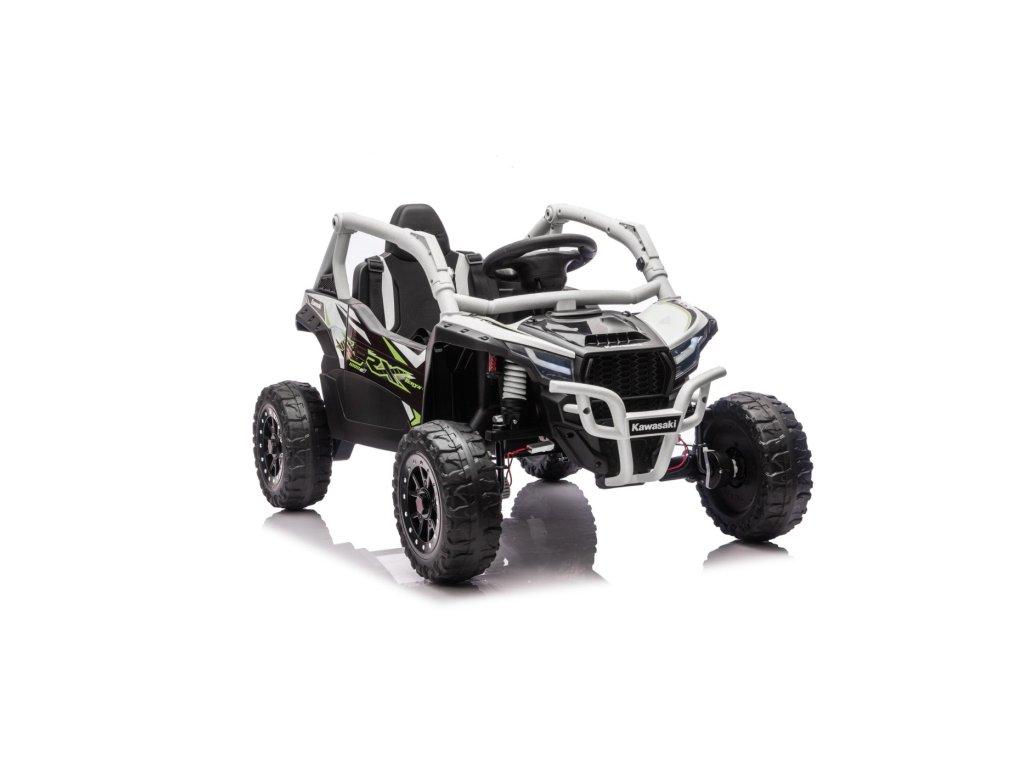 Stílusos Buggy Kawasaki TERYX KRX1000 gyerek kisautó ideális választás kis sofőrök számára, akik imádnak terepen és sima felületen is száguldozni. A nagy teljesítményű 24V-os rendszer négy motorral (2× 20W elöl, 2× 45W hátul) elegendő erőt biztosít még az egyenetlen terepen is. A kisautó puha EVA kerekekkel, kényelmes bőr üléssel és biztonsági övekkel van felszerelve. A STOP funkcióval ellátott távirányítónak köszönhetően a szülők mindig kézben tarthatják a járművet. A felszereltség tartalmaz LED lámpákat, audio panelt Bluetooth-szal, MP3, USB bemenettel és további funkciókkal.