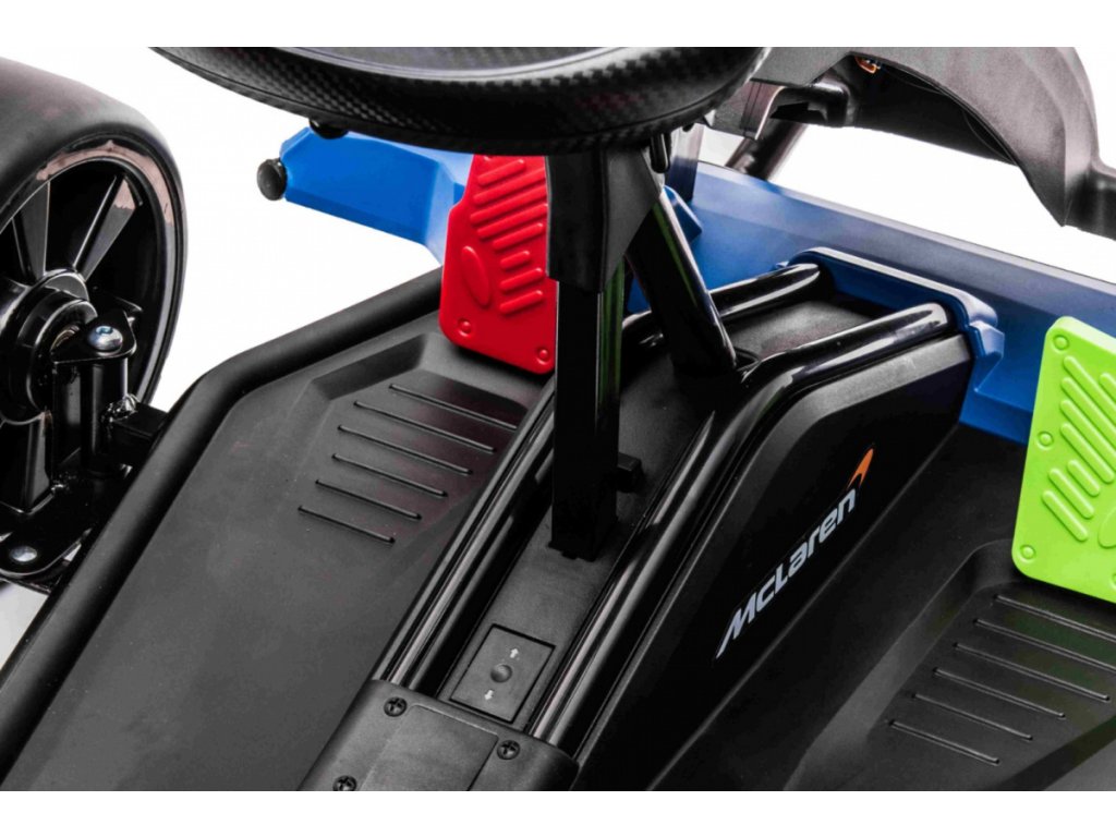 A felszereltség LED lámpákat és első EVA hab kerekeket tartalmaz. A kényelemről a jól formált ülés gondoskodik, a kormányon található zenepanel pedig kellemesebb szórakozást biztosít. A McLaren Drift elektromos gokart teherbírása akár 60 kg is lehet.