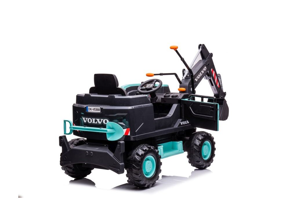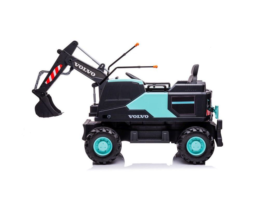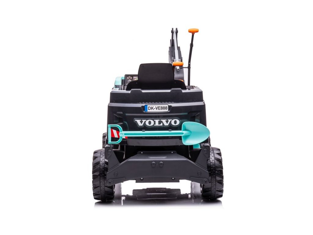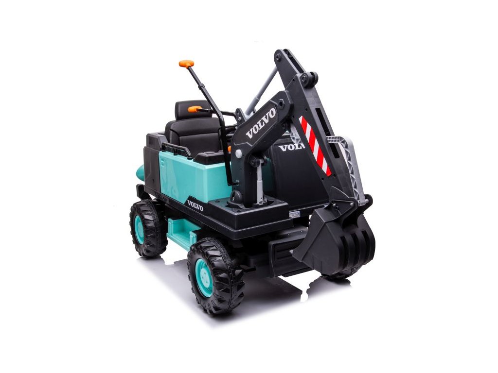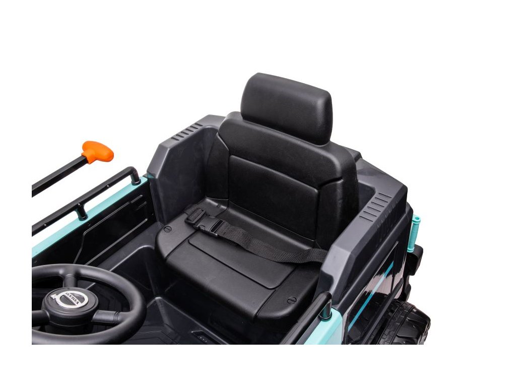 A Volvo gyermek elektromos kotrógép EVA kerekeken van, amelyek csendesek és nem zavarják a vezetést. A gyermek kényelmes, biztonsági övvel ellátott ökoBőrülésben ül, az utazást pedig biztosan kellemesebbé teszi az MP3 rádióból vagy a babakocsi hangszórójával csatlakoztatott mobiltelefonról hallgatható zene.