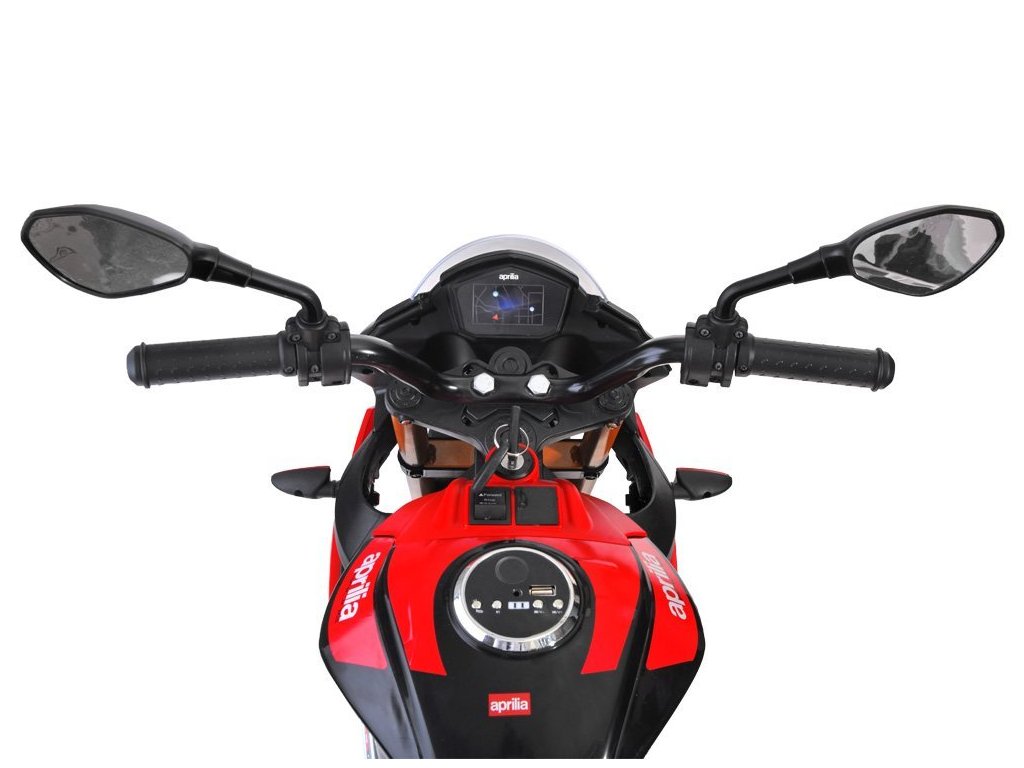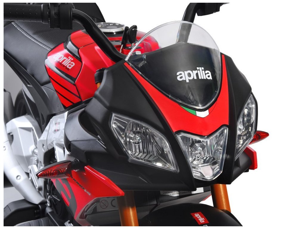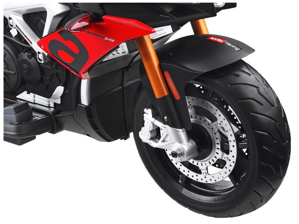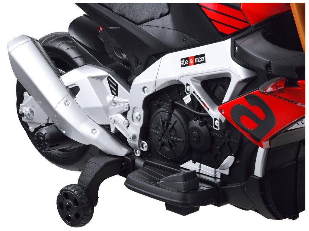 Az Aprilia Tuono V4 gyerek elektromos motorkerékpár két erős villanymotorral, EVA hab kerekekkel és puha ökológiai bőrből készült üléssel rendelkezik, amelyek együttesen biztosítják a kényelmes utazást.