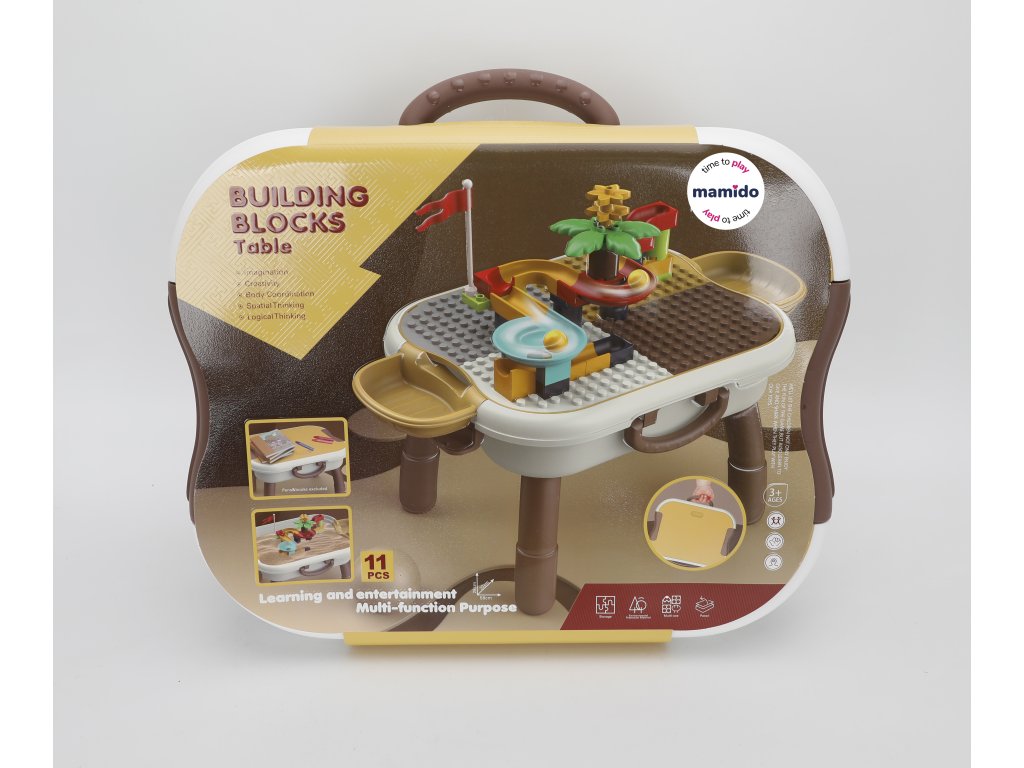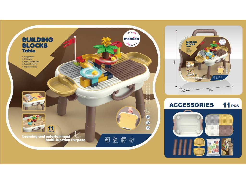 Tartalmaz egy készlet színes kockát és alkatrészt, amelyekből a gyerekek golyópályákat, tornyokat vagy más kreatív építményeket építhetnek. A gyermekasztal fejleszti a képzeletet, a finommotorikát és a logikai gondolkodást.