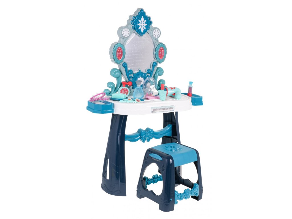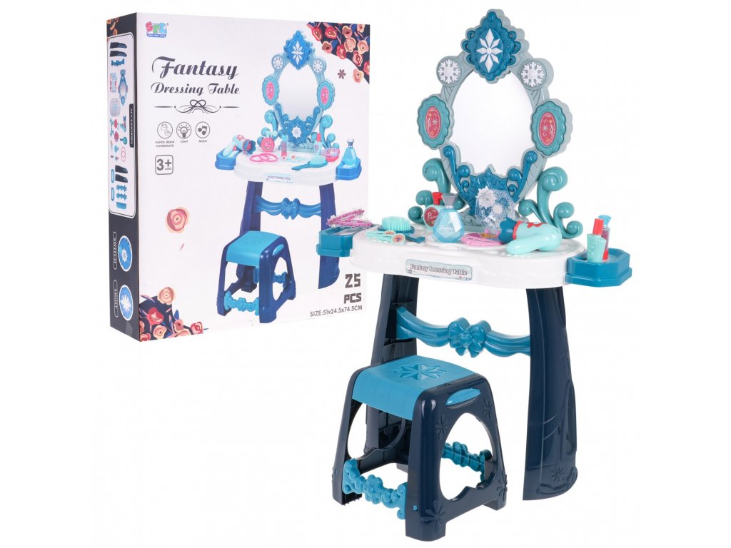 Öltözőasztal tükörrel, zsámolyokkal és kiegészítőkkel kis hercegnőknek három éves kortól . A játék hang- és fényeffektusokkal rendelkezik (villogó csillag a tükör felett és két csillag a tükör oldalán). A játék 3 db 1,5 V-os AA elemmel működik (nem tartozék). A csomag tartalmaz egy hajszárítót, egy kefét és egy kozmetikai próbabábut.