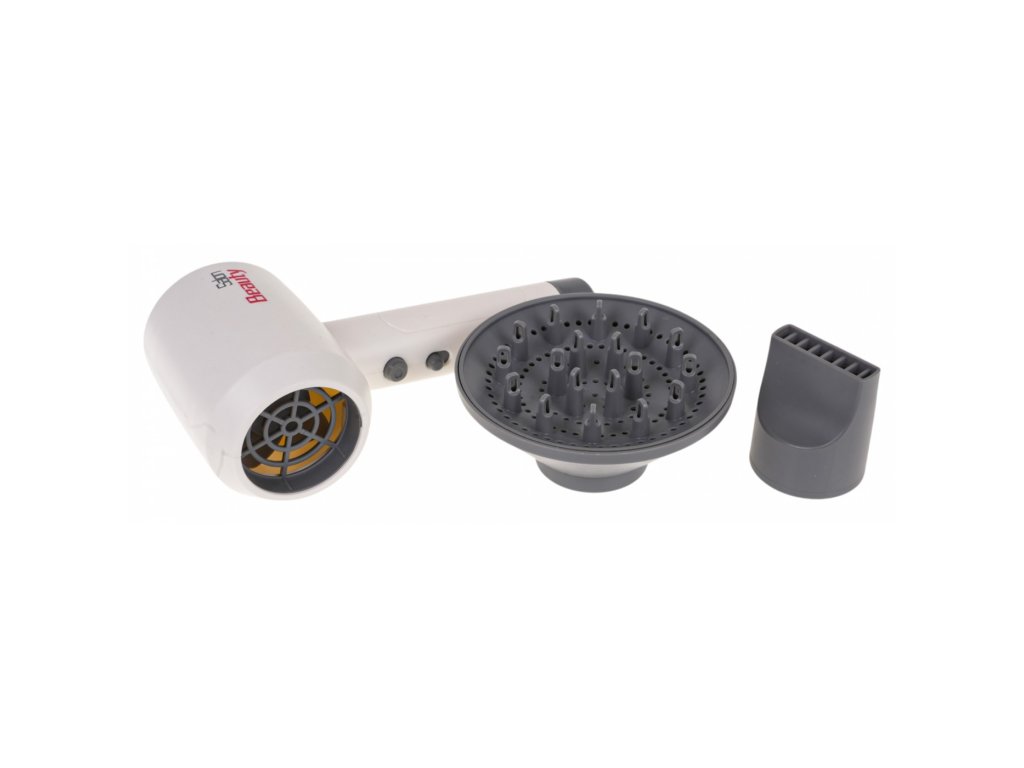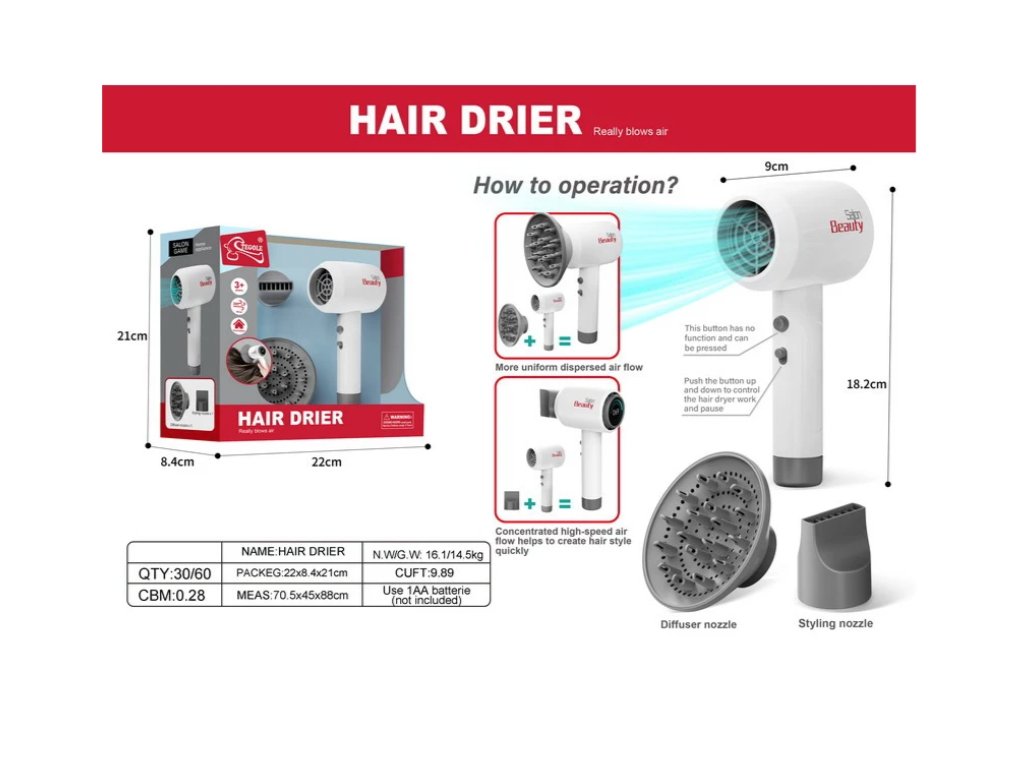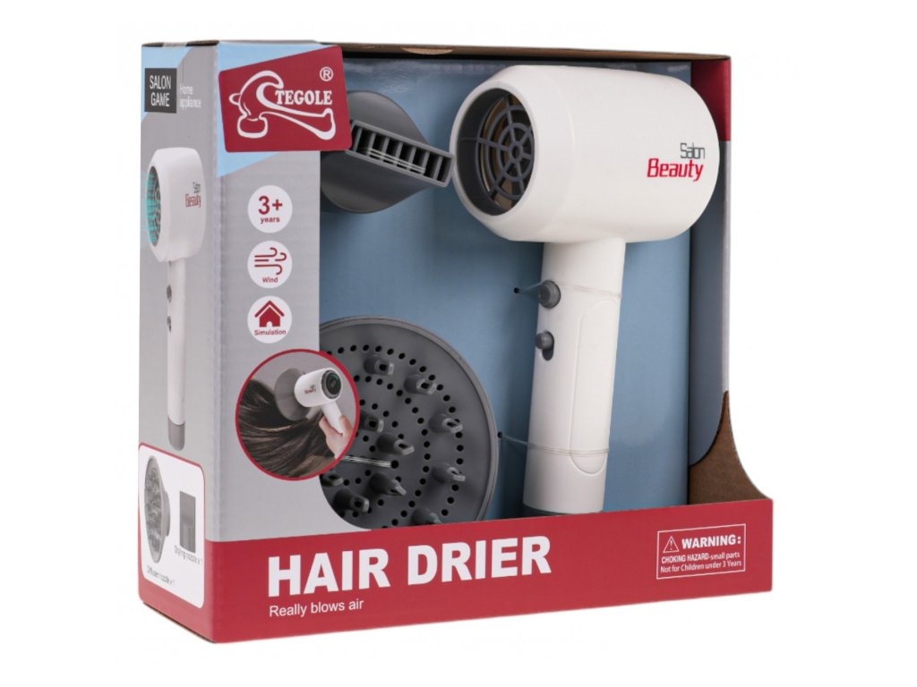 Interaktív hajszárító fújással és hangokkal 3 éves kortól gyerekeknek . A hajszárító valódinak tűnik, és gyönyörűen, a részletekre való odafigyeléssel készült. Bekapcsolt állapotban jellegzetes fújó hangokat ad ki és légáramot bocsát ki, ami szintén állítható. A készlet tartalmaz cserélhető szárító tartozékokat, például diffúzort és fókuszsapkát.