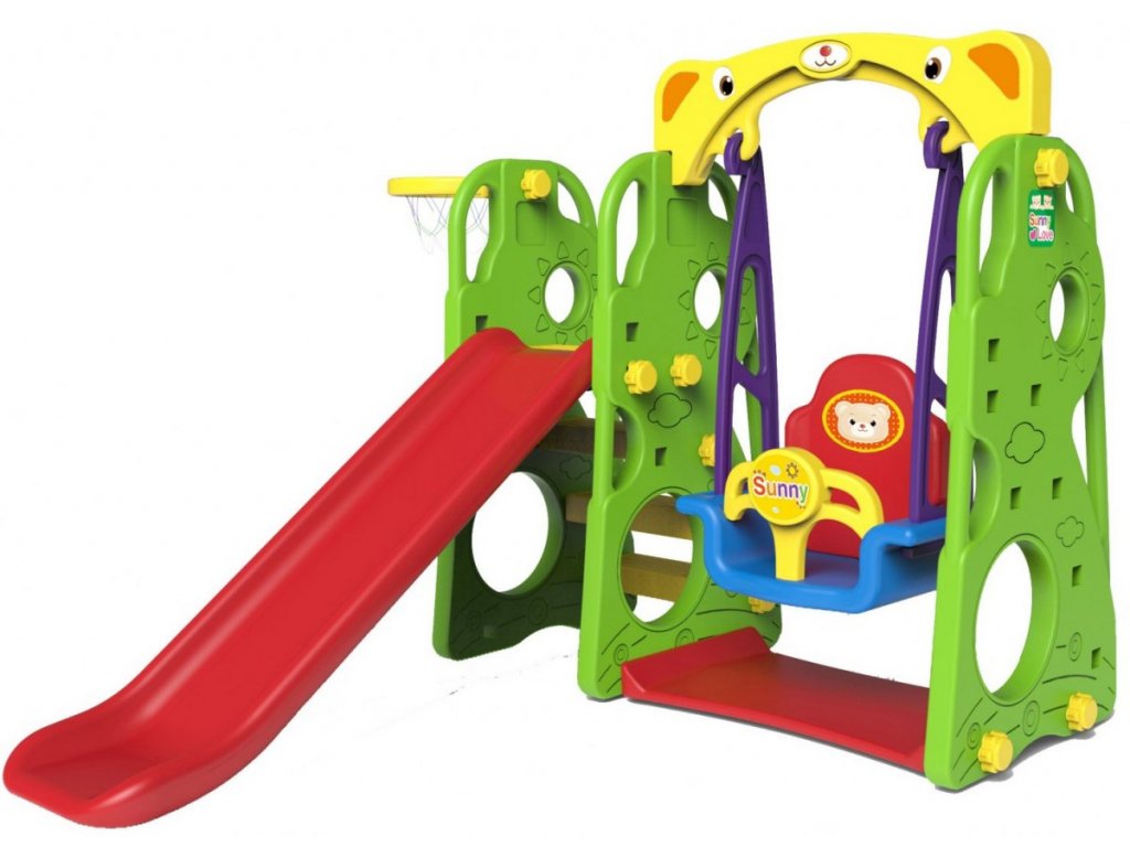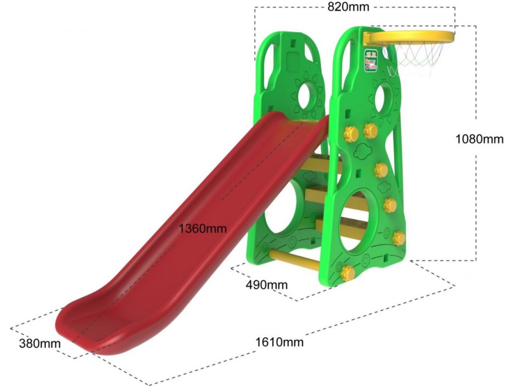 Kerti hinta csúszdával és kosárlabda karikával . A készlet kétféleképpen összecsukható, a kosár jobb vagy bal oldalon. A csúszda a gyermek életkorától függően elhelyezhető. A készlet beltéri és kerti használatra is alkalmas. Minden fal és alkatrész kétrétegű műanyagból készül. Megfelelő korosztály 1 éves kortól. A termék európai CE biztonsági tanúsítvánnyal rendelkezik.