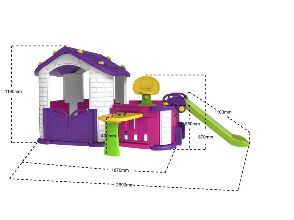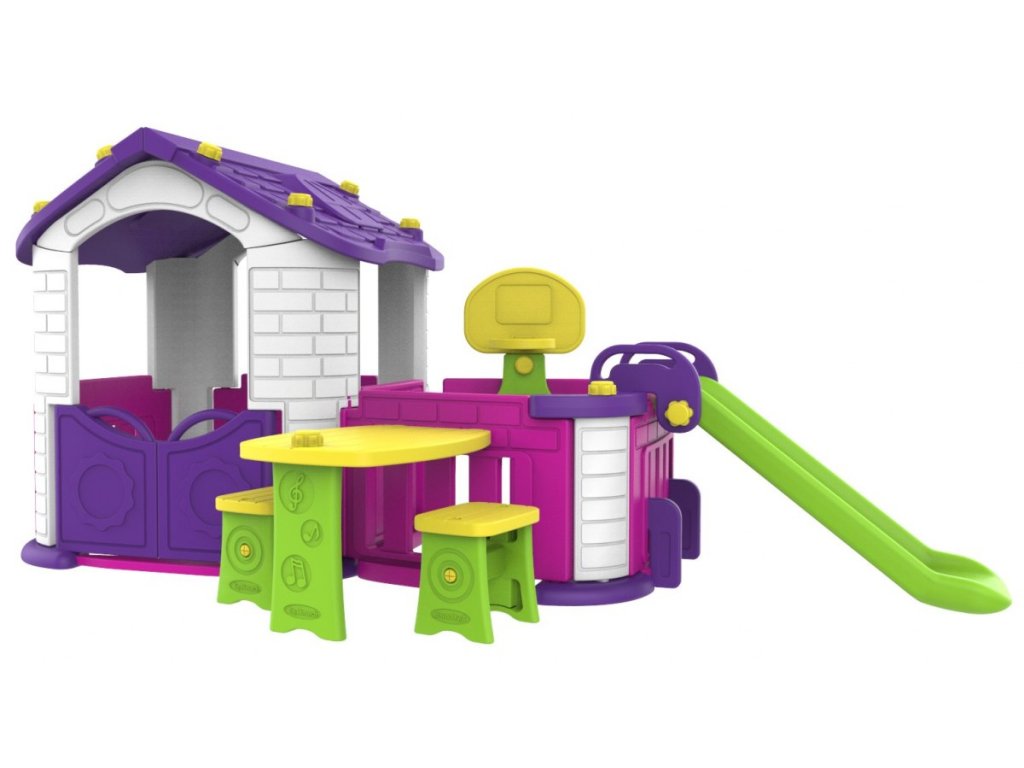 Kerti ház 5 az 1-ben csúszdával, kosárlabdával és kerttel asztallal. A ház minden eleme kiváló minőségű HDPE anyagból készült. Nagy sűrűségű polietilén, 0,942-0,965 g/cm3. A HDPE egy rugalmasabb anyag, és ellenáll a mechanikai sérüléseknek, mint az egyéb ilyen típusú konstrukciókban használt anyagok. Minden fal és alkatrész kétrétegű műanyagból készül. Ezenkívül lehetőséget biztosít a falak homokkal vagy adalékanyaggal való kitöltésére, amely biztosítja a szerkezet stabilitását. A nagy alkatrészek megkönnyítik az összeszerelést.