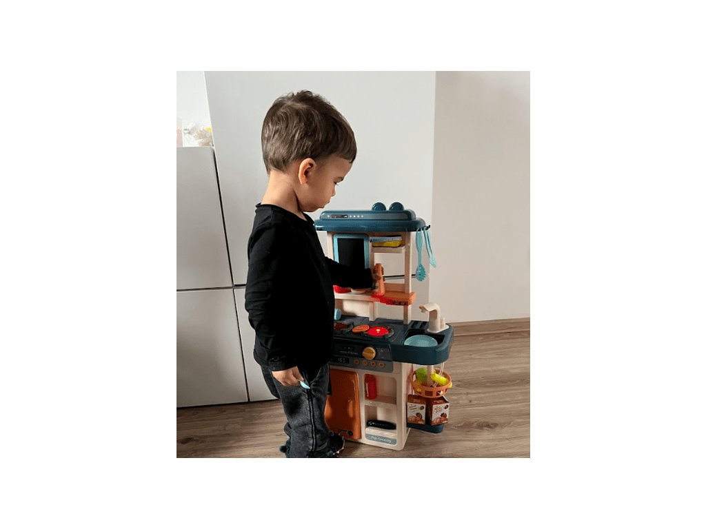 Gyermek konyhai készlet, amely 42 elemből áll. A konyhában található egy mosogató csappal, amelyből víz folyik, két indukciós főzőlap, mozgatható gombok, nyitható hűtőszekrény, polcok és sok más konyhai kiegészítő. A tűzhelyen a főzőlapok bekapcsolásakor főzési hangokat hallhat, amelyet villogó piros fény kísér. Érdekes kiegészítő a leíró tábla, amelyre bevásárló listákat vagy recepteket írhat.