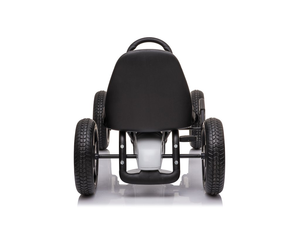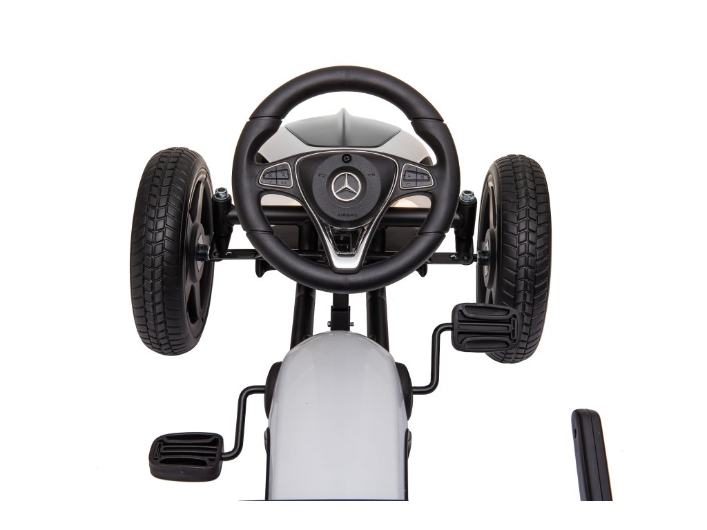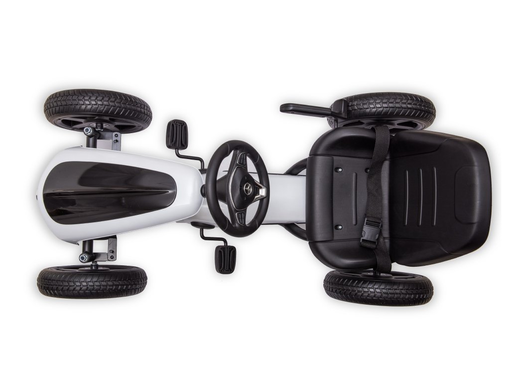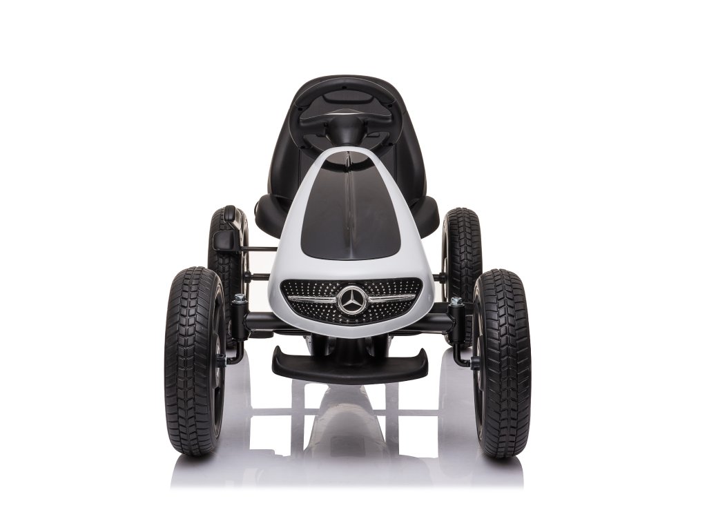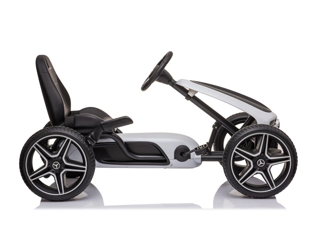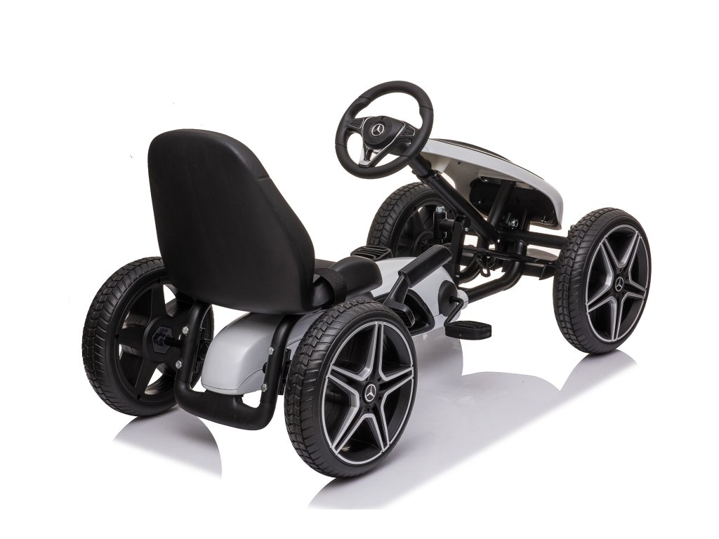Gyermek pedálos Mercedes gokart nagyon jó minőségű gyermek pedálos autó modern designnal. A precízen kidolgozott fém szerkezet a minőségi műanyaggal kombinálva garantálja, hogy a gokart nem egy szezonra szól. A gyermek biztonsága érdekében funkcionális kézifékkel van ellátva, és a magas, ergonomikusan kialakított üléstámla is vigyáz az egészségre. Az ülés a gyermek kényelmének megfelelően állítható. A pedálos autó lehetővé teszi a gyermek számára az előre- és hátramenetet. A gokart kerekei lágyított gumis műanyagból készültek, ez biztosítja a tökéletes tapadást a felülethez. A gyermek pedálos gokart kiváló mozgásforma a gyermekek számára. Az emberi meghajtásnak köszönhetően környezetbarát és zajtalan.