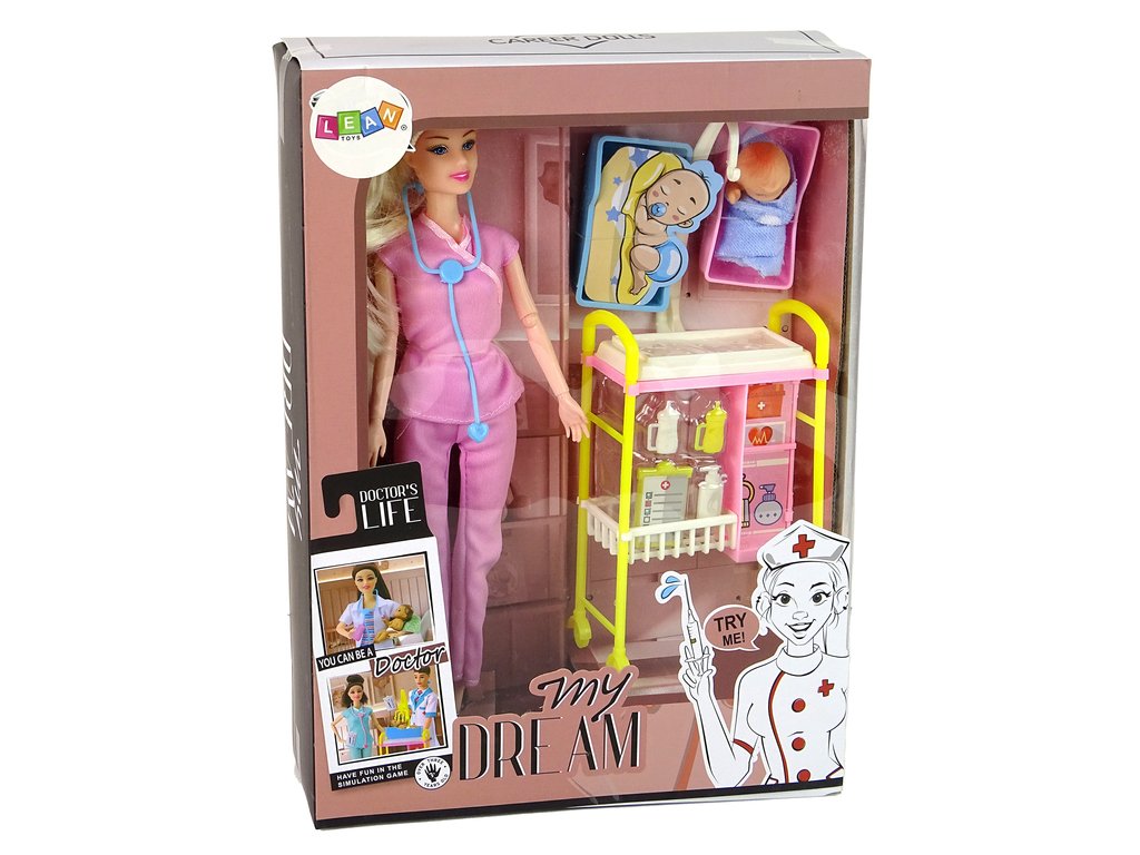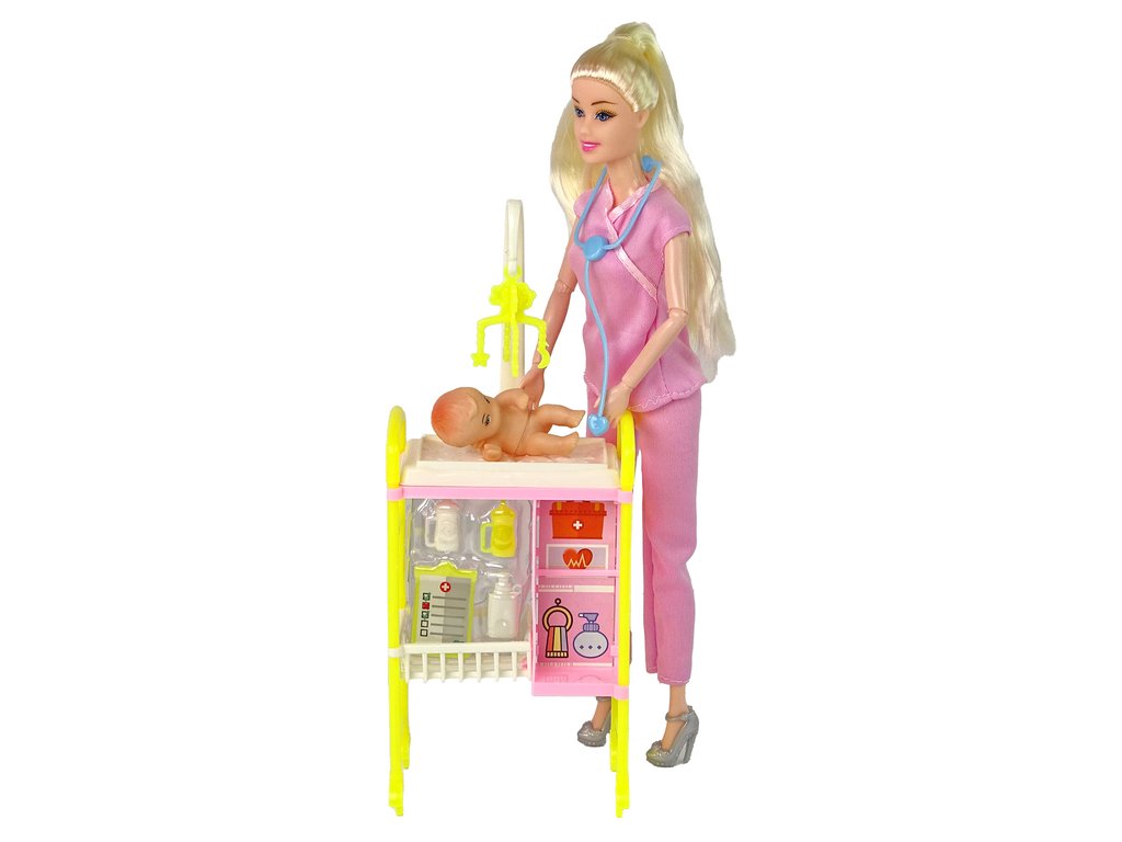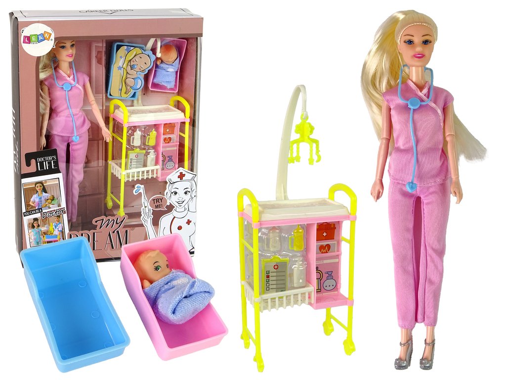Bemutatunk egy egyedi orvos babát , amely hosszú, szőke hajával és kék szemével fog elkápráztatni. Rózsaszín orvosi kötényből és nadrágból álló, elegáns ezüst sarkú cipővel párosított ruhája magabiztos és stílusos megjelenést kölcsönöz.