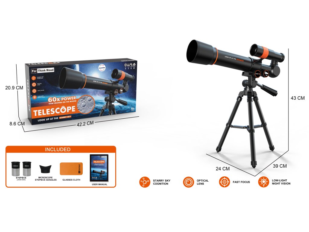 Fedezze fel az éjszakai égbolt titkait egy gyerekeknek szánt távcsővel, amely akár 60-szoros nagyítást kínál. A kiváló minőségű optikai lencséknek köszönhetően lehetővé teszi a Hold, a csillagok és a távoli objektumok megfigyelését. A stabil állvány kényelmes és pontos megfigyelést biztosít, míg a kompakt méretek ideális segédeszközzé teszik a távcsövet a 8 éves és idősebb kis felfedezők számára.