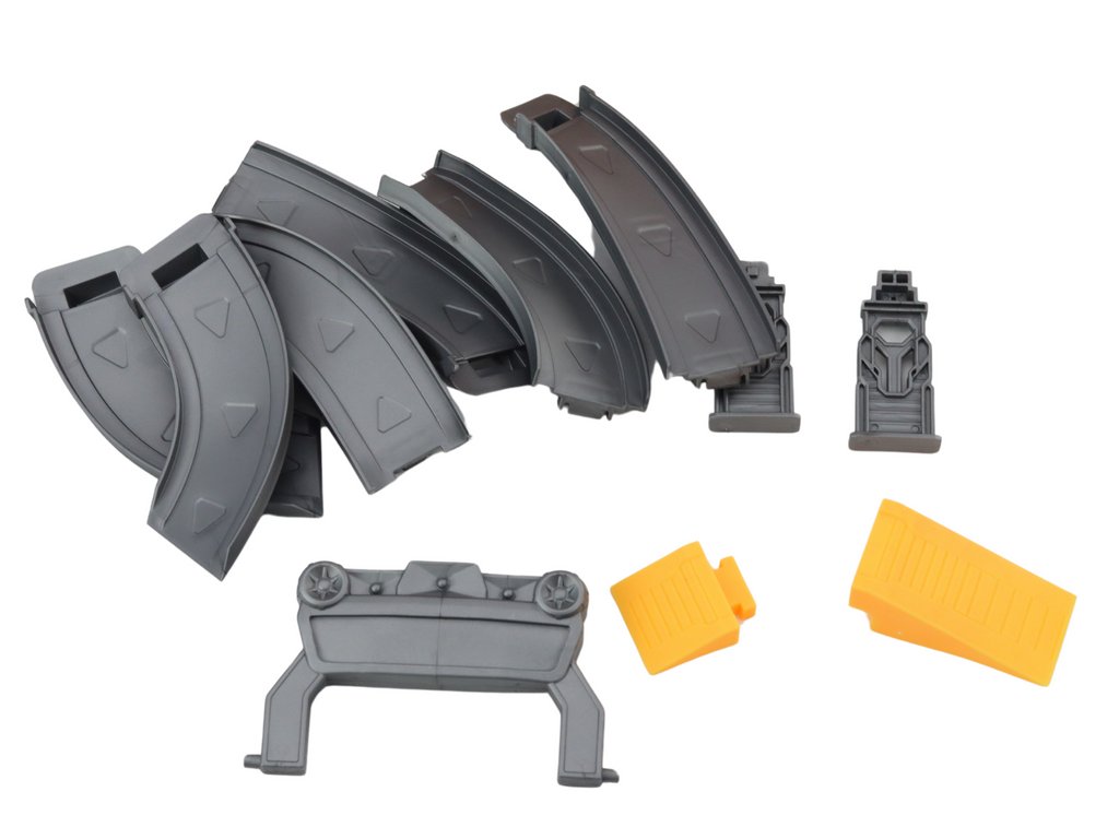 A készlet 6 akcióra kész autót tartalmaz, amelyek összecsukás után az alapban tárolhatók. Az állomás tárolóként is szolgálhat az autók számára, a praktikus fogantyú pedig lehetővé teszi, hogy bőröndként hordozzuk, így a készlet praktikus és könnyen szállítható.