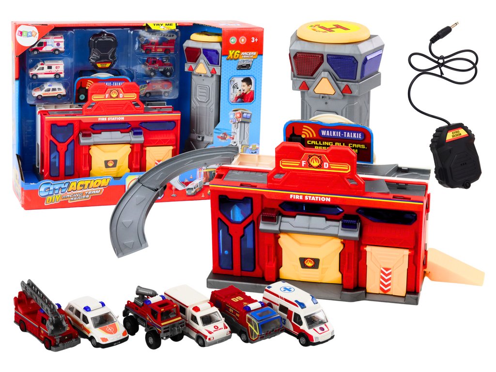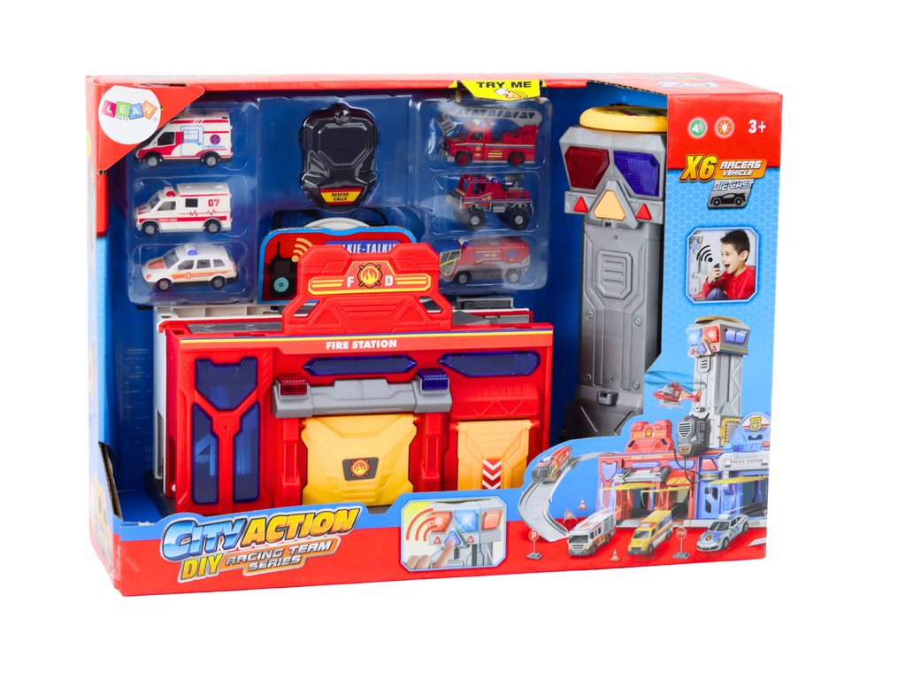 Gyermek tűzoltó állomás irányító központtal és 6 autóval