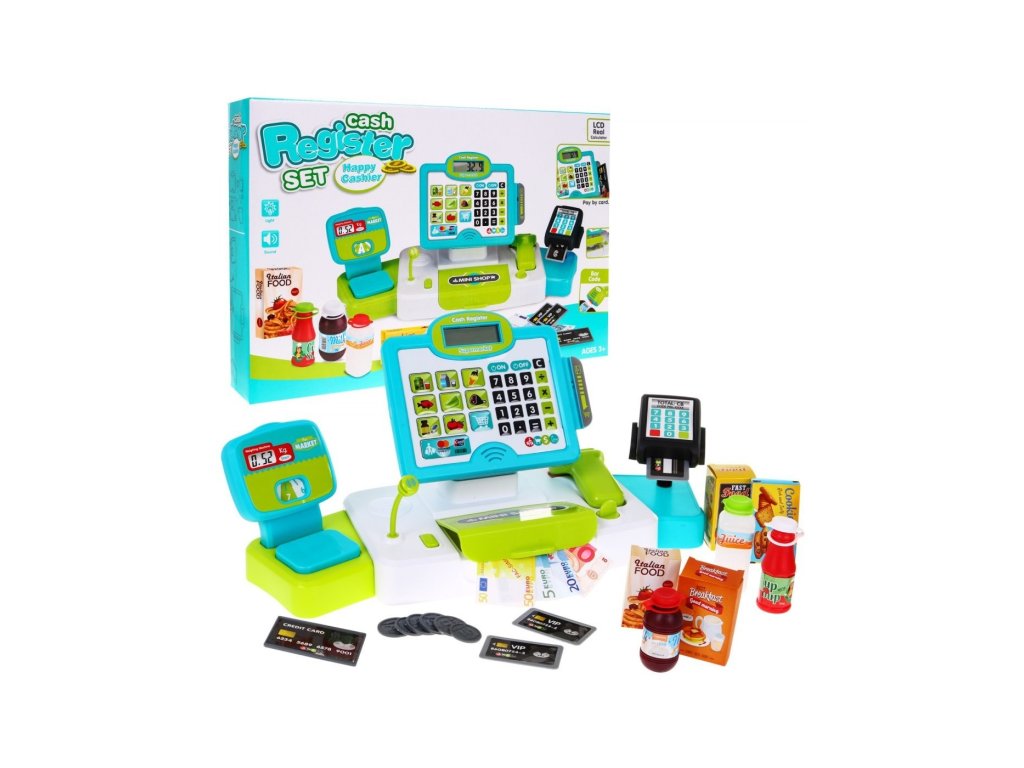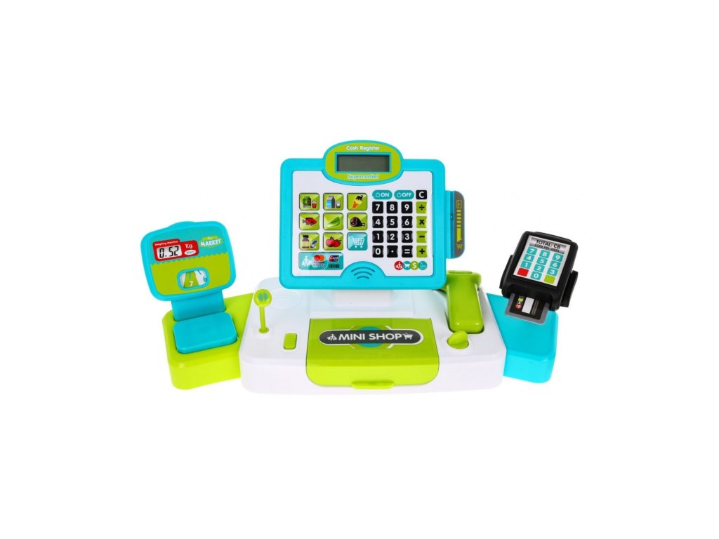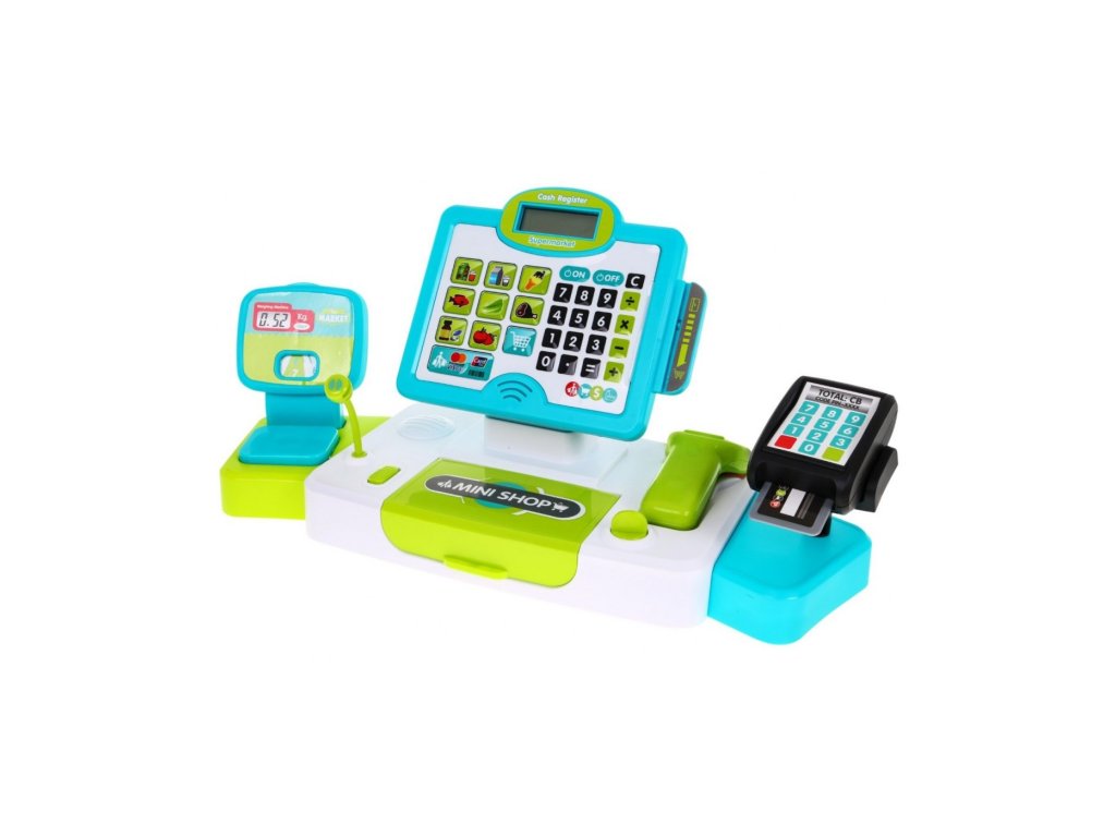 A pénztár termékképeket és tényleges számológépet tartalmaz. A vásárlás megkezdésekor az olvasóval beszkennelheti a termékeket, megnyomására a lapolvasó sípoló hangot ad ki, ami egy normál bolti munkára emlékeztet. A terminál utánzata lehetővé teszi a gyermek számára, hogy kártyával fizessen. A pénztárgépre erősített mikrofon azt a benyomást kelti, mintha egy igazi üzletben lennénk. A maradék pénz visszaküldéséhez nyomja meg a pénztár alatti gombot.