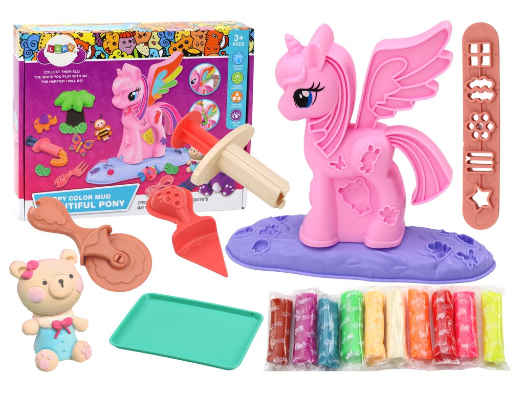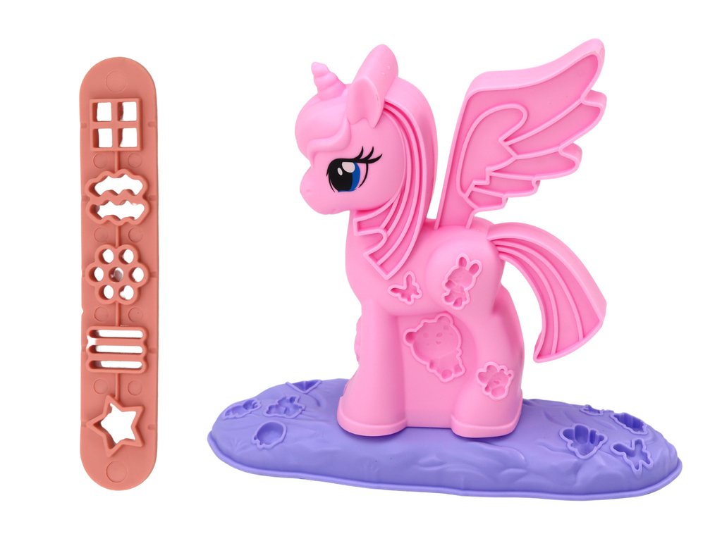 Az egyszarvúnak van egy állványa, amelyre különféle formákat nyomtatnak, például csokornyakkendőt, csillagot, szívet vagy állatokat. A készlet 4 db modellező kiegészítőt is tartalmaz, mint például kés vagy spatula, így gyermekének lehetősége nyílik nagyobb számú formát alkotni a modellből.