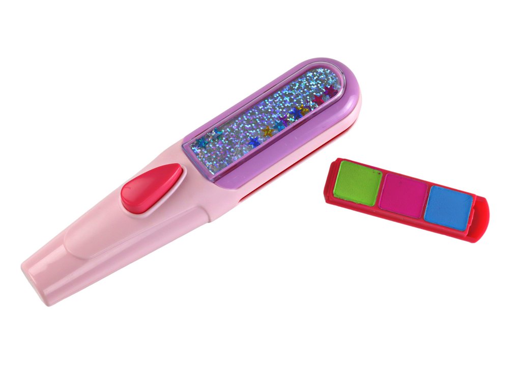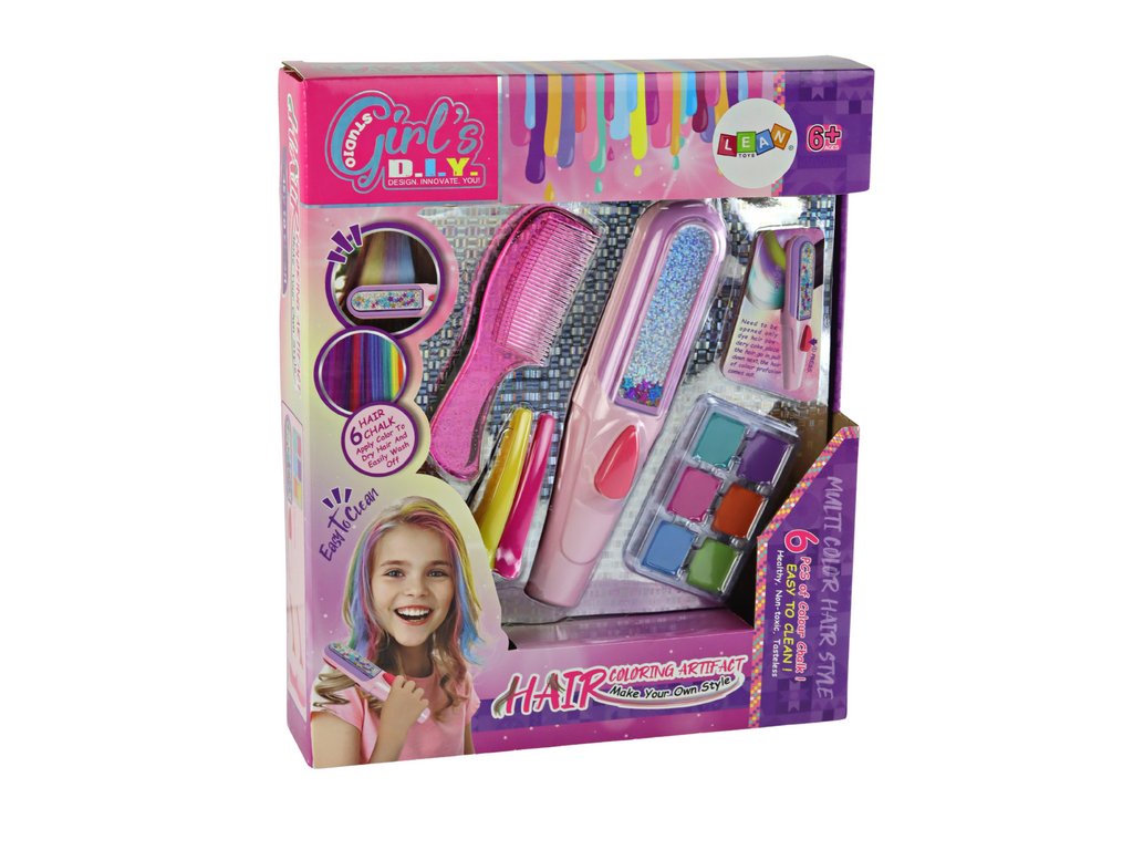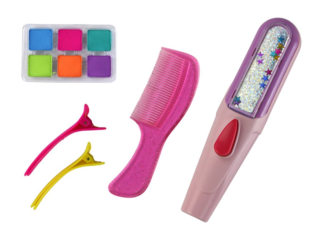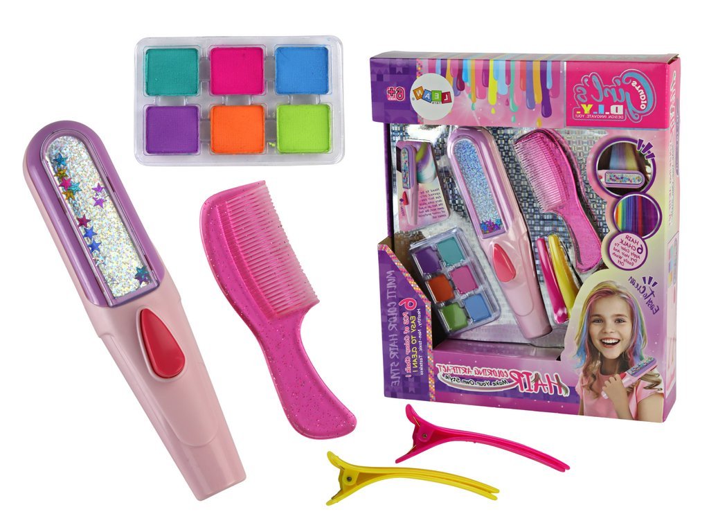 A készlet tartalmaz egy speciális eszközt, amely lehetővé teszi a biztonságos hajfestést. Ez az innovatív eszköz biztosítja a haj egyenletes fedését a színes lemezekkel, kiküszöbölve a haj károsodásának vagy irritációjának kockázatát. A készletben hat színű tányér található: türkiz, rózsaszín, kék, zöld, narancs és lila. Nekik köszönhetően a kislány szabadon keverheti a színeket, egyedi árnyalatokat, hatásokat alkothat a haján.