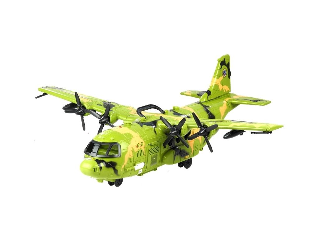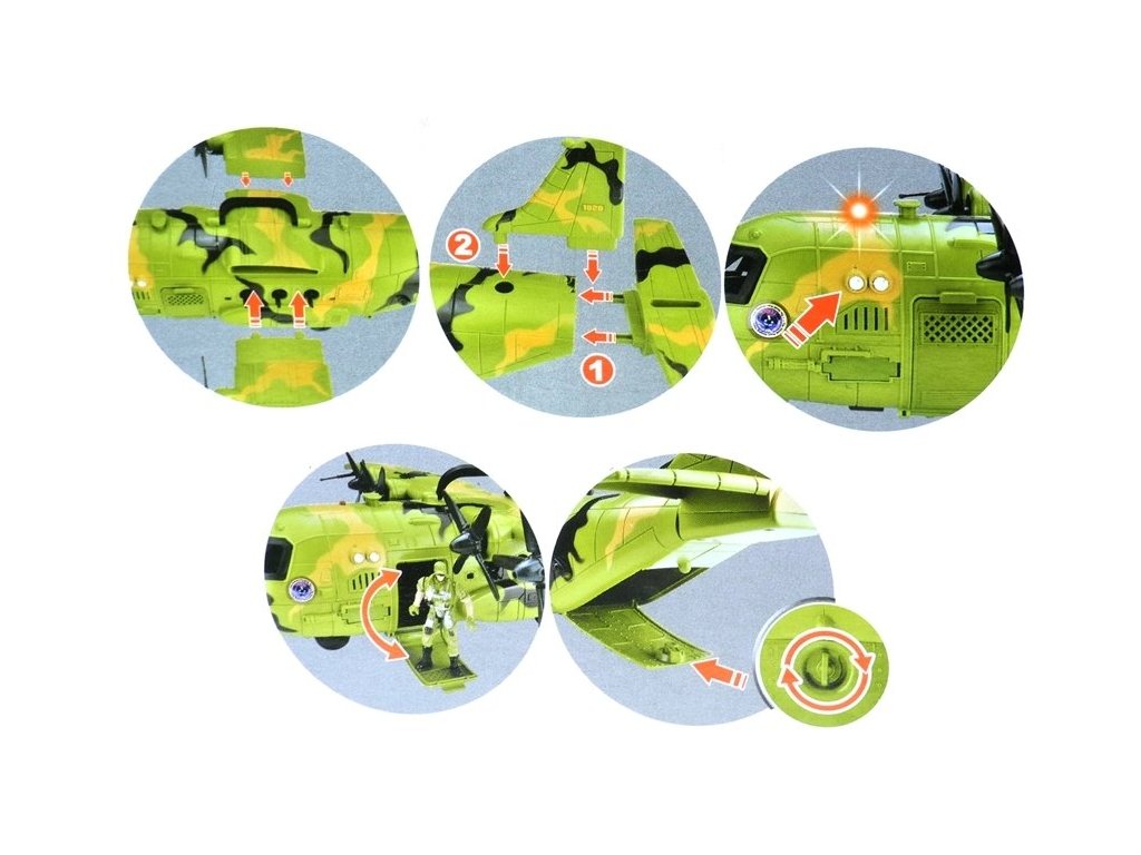 A katonai sorozatból készült készlet minősített, kiváló minőségű műanyagból készült. Az álcázó mintákkal kiegészített repülőgép színe tökéletesen utal a katonai színekre, amitől a játék nagyon valósághű megjelenésű. A repülőgép nagyon nagy - szárnyfesztávolsága 64 cm , hossza 55 cm. A repülőgép szerkezete mozgó és nyitható alkatrészeket tartalmaz. Pörögnek a gép szárnyain a propellerek, ahogy a gép ablakaiból kiálló hármaságyú is. A gép elején és hátulján lévő ajtók kinyílnak, lehetővé téve a figurák elhelyezését a játék belsejében . A gép oldalán két gomb található, melyek megnyomására fény- és hanghatásokat aktiválnak, így még élvezetesebbé válik a játék!