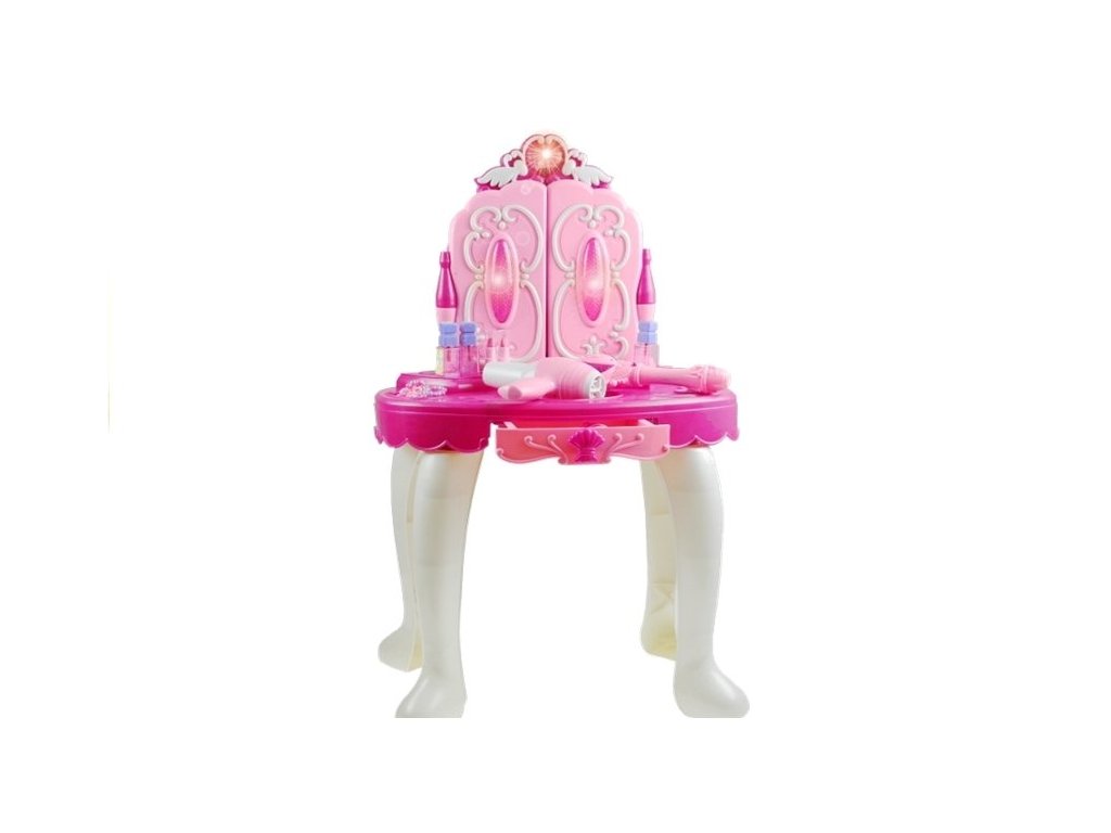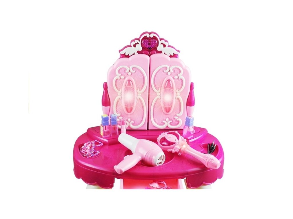 A sminket kedvelő kislányoknak ez a hercegnős fésülködőasztal ideális ajándék. A fésülködőasztal ajtaja varázspálcával nyílik, az asztal fel van szerelve fényekkel, hangokkal és MP3- hoz való csatlakozás lehetőségével. Az elemmel működő hajszárító is remek kiegészítő.