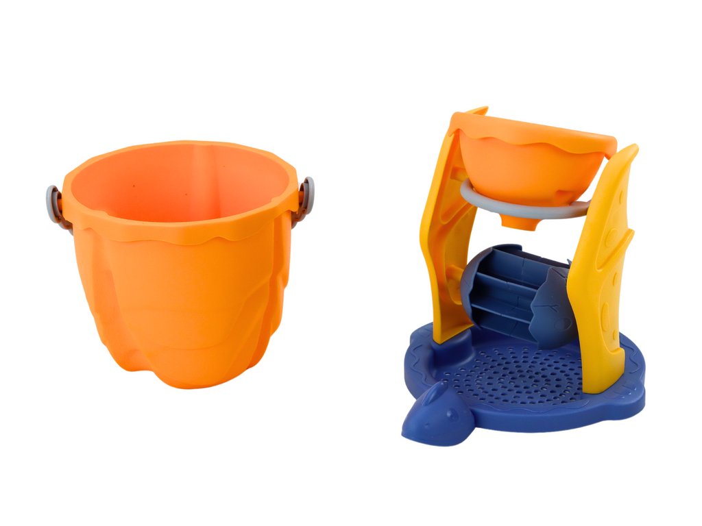 A szűrő fedőként szolgál a vödör számára, így könnyebben elválasztja a homokot a víztől. A szűrőre egy daráló van felszerelve, hogy interaktivitást adjon a játéknak, így a gyerekek nézhetik, ahogy a homok átömlik a darálón, és mozgásba hozza azt.