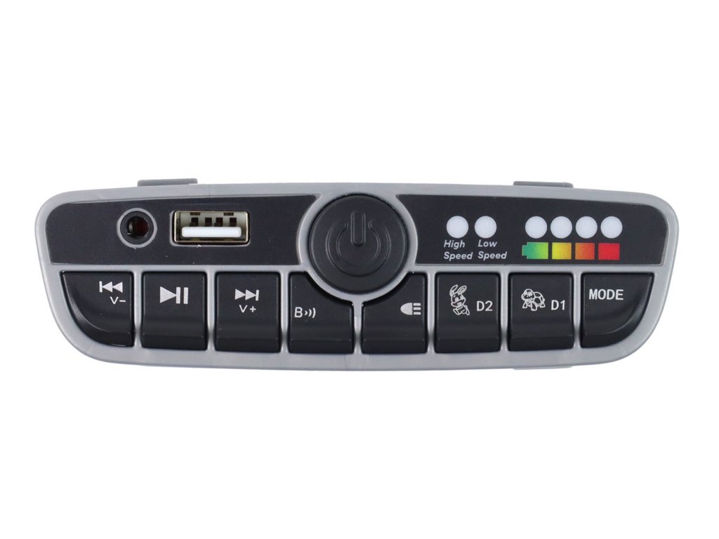 24V-os zenei panel XMX623B elektromos járműhöz. Ennek köszönhetően a gyerekek kedvenc dalaikat hallgathatják vezetés közben. A panel MP3, AUX és USB bemeneteket tartalmaz, amelyek lehetővé teszik a zene lejátszását különböző eszközökről. Ezenkívül előre felvett hangokkal is rendelkezik a kormányon, amelyek még szórakoztatóbbá teszik az egyes utazásokat.