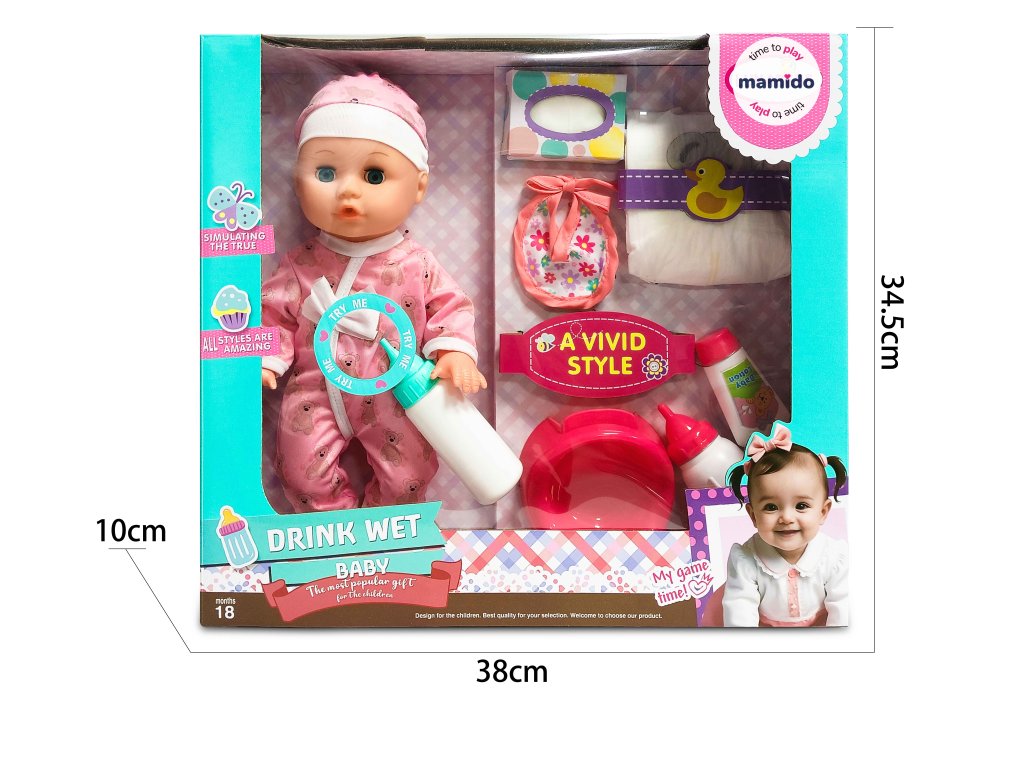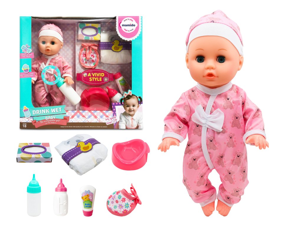 A 35 cm méretű baba puha rózsaszín ruhát és sapkát visel, és nyomásra aktiválódó hangfunkciókkal rendelkezik. A cumisüvegből való ivás után a baba tud pisilni a mellékelt "wc-be", ami támogatja a valósághű játékot, a finommotorikát és a kreativitást. A készlet tartalmaz pelenkát, előkét, cumisüvegeket és egy zsebkendősdobozt is – mindent, amire egy kis anyukának vagy apukának szüksége lehet.