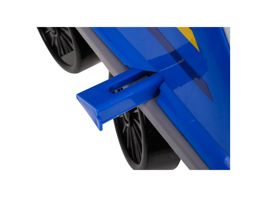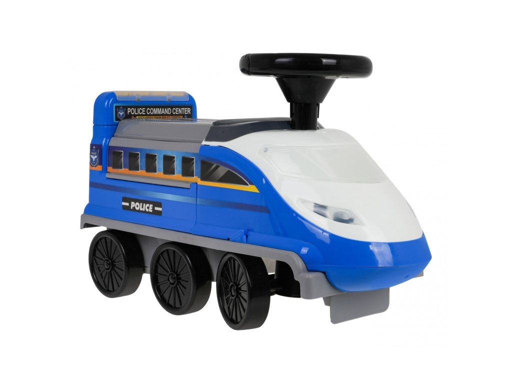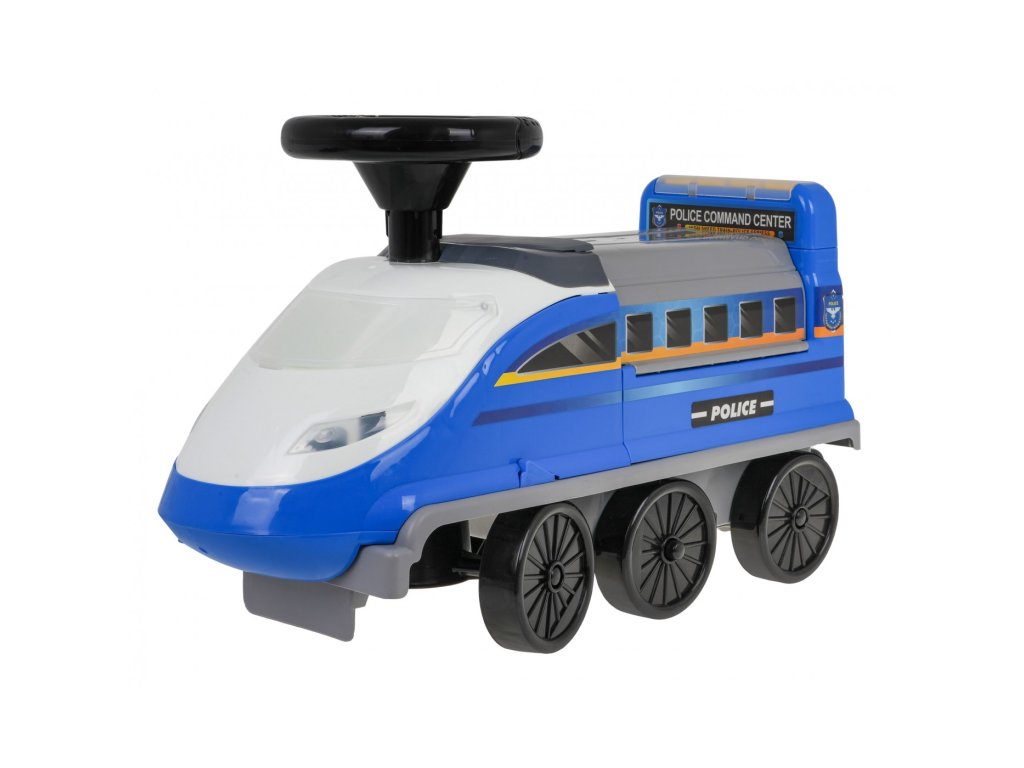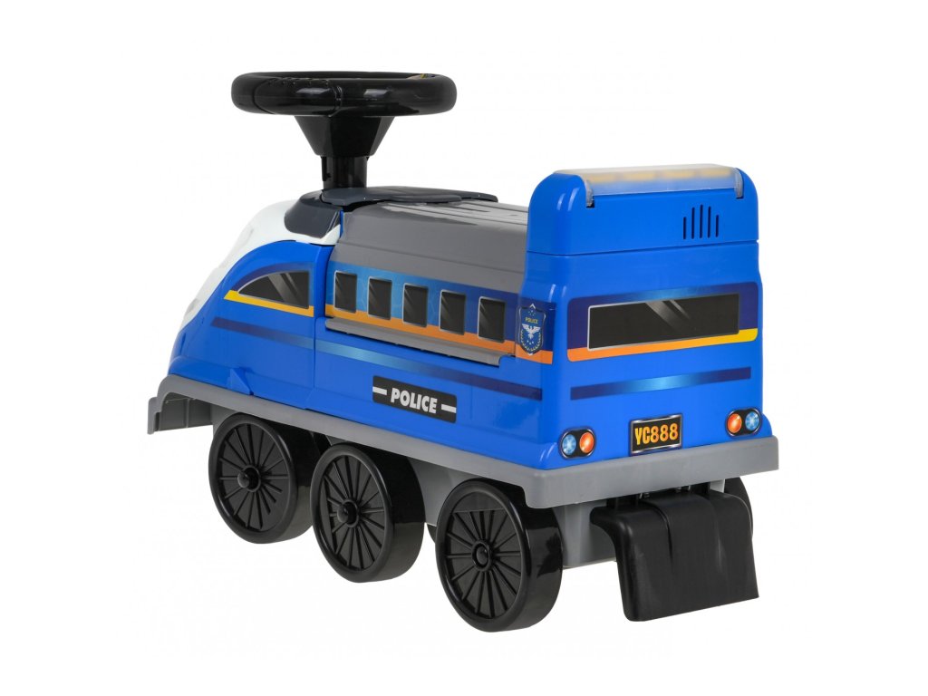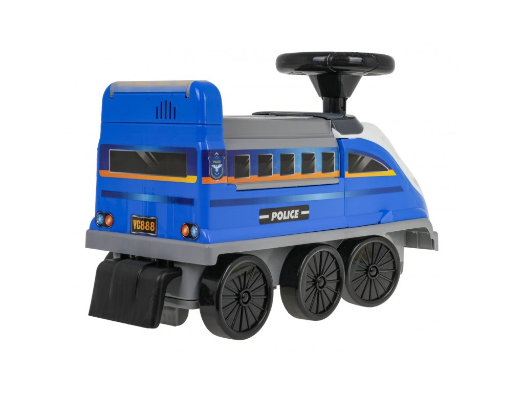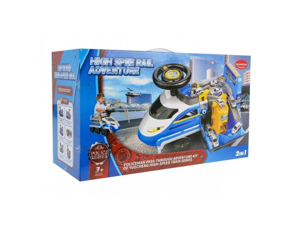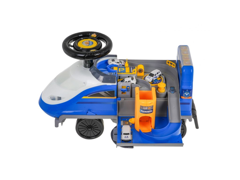 A mozdonynak 6 kereke van, köztük két első forgatható kerék. Az ülés alatt kihajtható rendőrségi parkoló található csúszdákkal, mozgatható lifttel, nyitósorompóval, emelővel és forgókerékkel. Minden mozgó alkatrész kézi működtetésű. A parkoló alatt egy tároló is található a gyerekek kincseinek. A mozdony elején is van egy nyitható szélvédőnk, ahol szabad hely van különféle apróságoknak. A mozdony oldalai kihúzható támasztékkal vannak felszerelve a gyermek lábához .