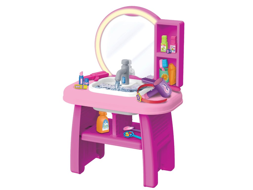 A kozmetikai asztal stabil szerkezetű és tágas munkafelülettel rendelkezik. Tartozék: hajszárító, kefe, fésű, rúzs, parfümök, kiegészítők és egyéb tematikus játékok. A gyerekek utánozhatják a sminkelést, fésülést és a mindennapi ápolást – mindezt biztonságos játék formájában.
