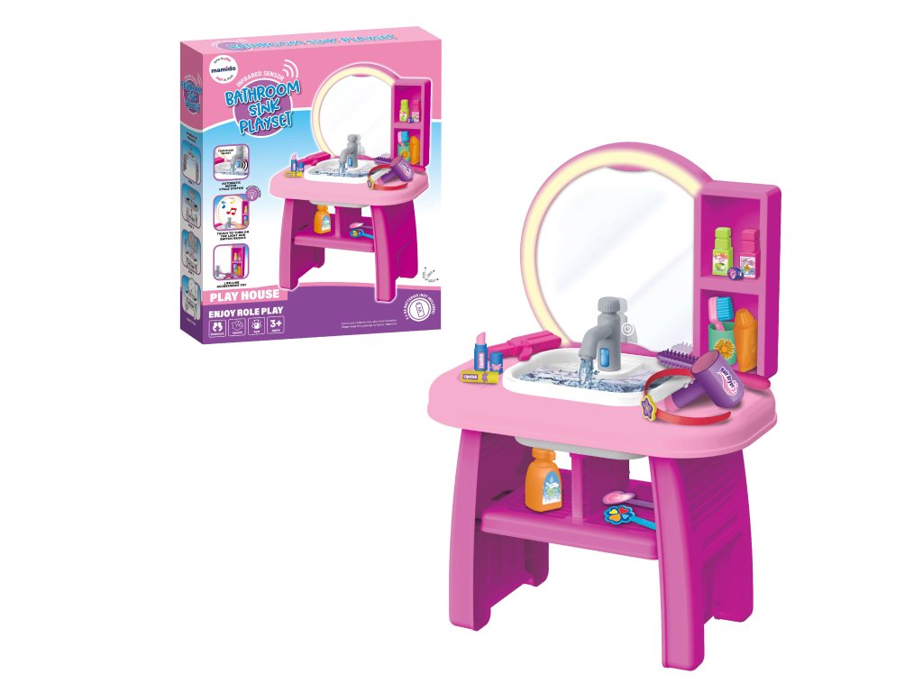 Nagy tükör, tárolópolcok és rengeteg kozmetikai kiegészítő a kreatív és szórakoztató játékhoz. Érintésre a tükör felgyullad és dallamot játszik le, ami még több varázslatot ad a játéknak.