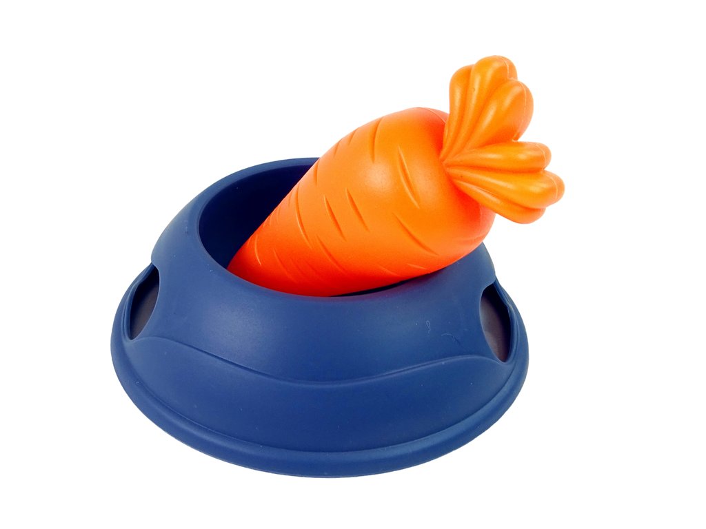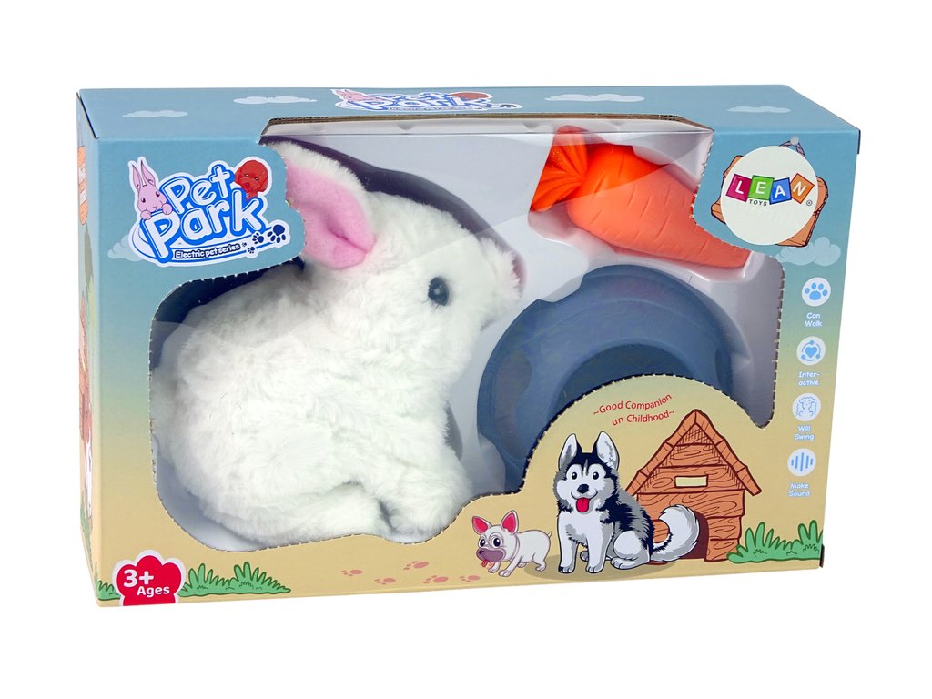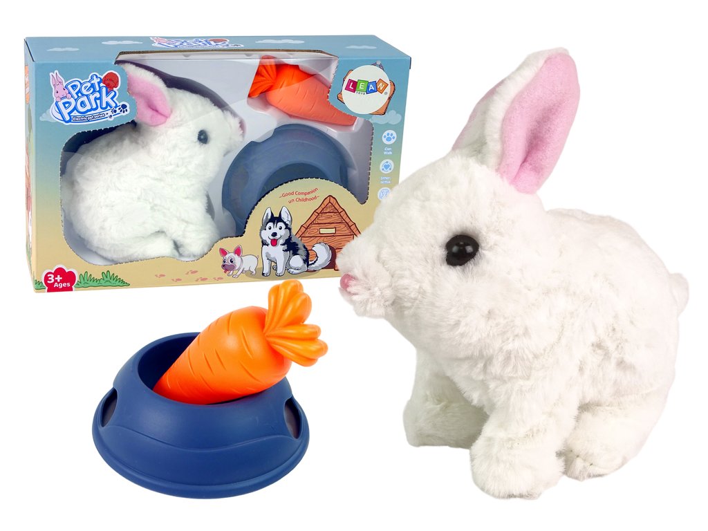 A nyuszi taps, mozgatja a fülét és édes hangokat hallat, ahogy előrehalad. Tehetsz egy sárgarépát a tálba, és etetheted a nyulat!