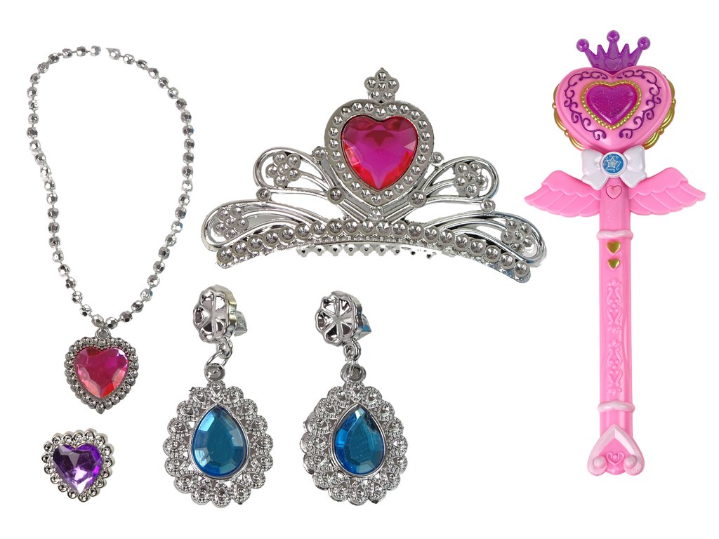 A varázslatos készlet fülbevalót, koronát, gyűrűt és színes kövekkel díszített nyakláncot is tartalmaz.
