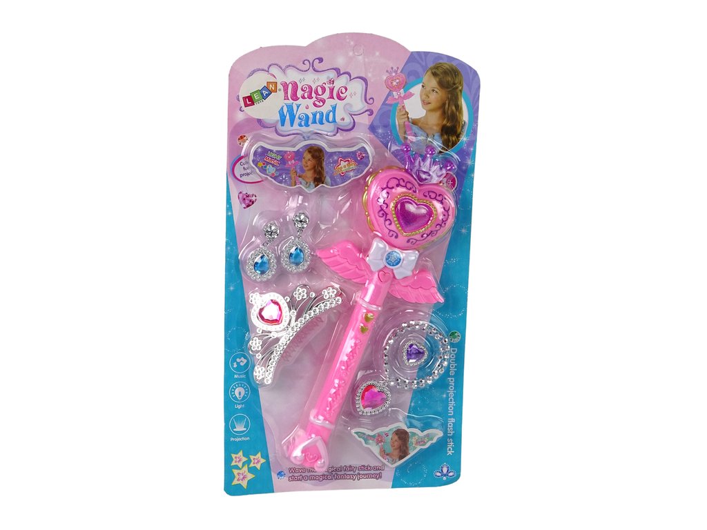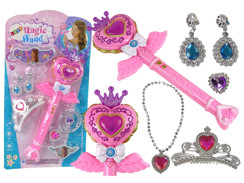 Egy gyönyörű kis tündérkészlet varázspálcával és ékszerekkel ideális ajándék 3 év feletti lányoknak. A szívvel és koronával ellátott rózsaszín pálca interaktív funkcióinak köszönhetően felejthetetlen szórakozást varázsol hosszú órákon át. A pálcán egy kivetítő található, amely varázslatos égbolttá varázsolja a szobát, tele csillagokkal, villogó fényekkel és mesedallamokkal az előlapon gombnyomásra bekapcsol.