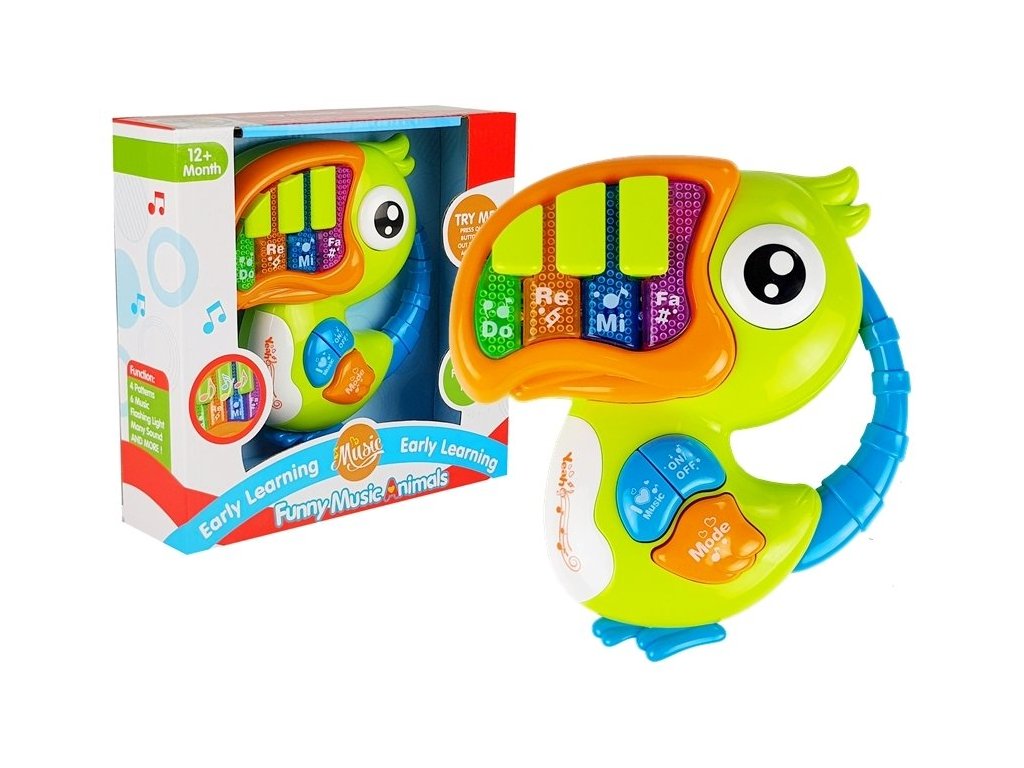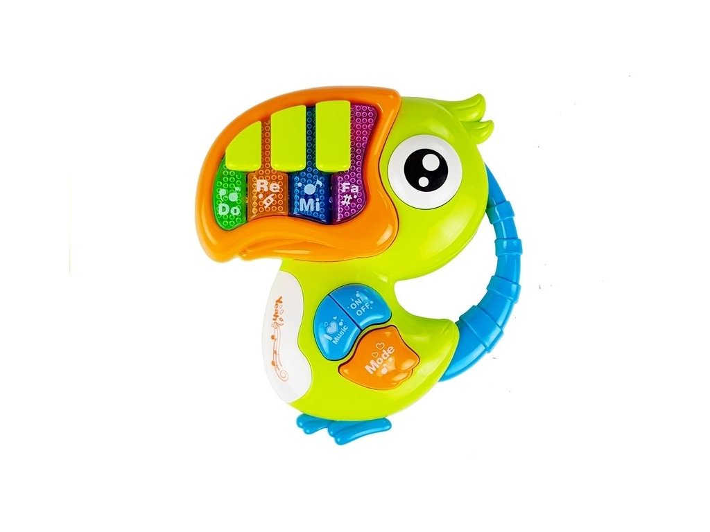 A megfelelő fejlődés és a mosoly az arcon nagyon fontos minden gyermek életében. A babazongora különböző funkciói, valamint színei és mintái arra késztetik a gyermeket, hogy már kiskorában felismerje és megtanulja az új hangokat, színeket és formákat. A zongorázás pozitívan befolyásolja gyermeke hallását és látását, és serkenti a képzeletét. A színes papagáj formájú zongora minden gyermeket megörvendeztet, zenei gombokkal rendelkezik, a szórakozást pedig a "DO", "RE" és "MI" gombok izzó fényei kísérik. A játék a BE/KI gombbal indítható. Mellette található a "MODE" gomb, amely megváltoztatja a zongorahangok üzemmódját. Nyomja meg a gombokat, hogy vidám dallamokat, állathangokat vagy szabványos zongorahangokat hallgasson, és játssza le saját dallamát.