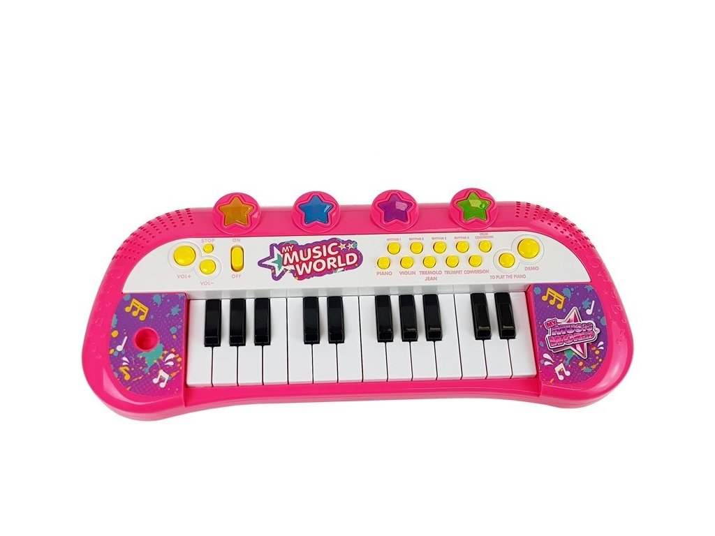 Az oktatási interaktív zongora segít felébreszteni a zene iránti szenvedélyt, de fejleszti a készségeket és a ritmusérzéket is. A lányoknak szánt zongora 24 billentyűs, rózsaszín és lila színekben és 4 csillogó csillaggal kiemelkedik. A zongora a legjobb minőségű, minősített szilárd anyagból készült.