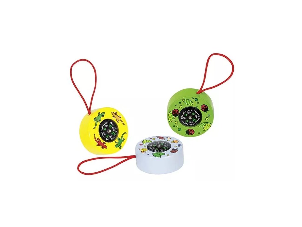Könnyű iránytű, amely műanyag és fa alkatrészeket kombinál, gyermekek számára tervezve.