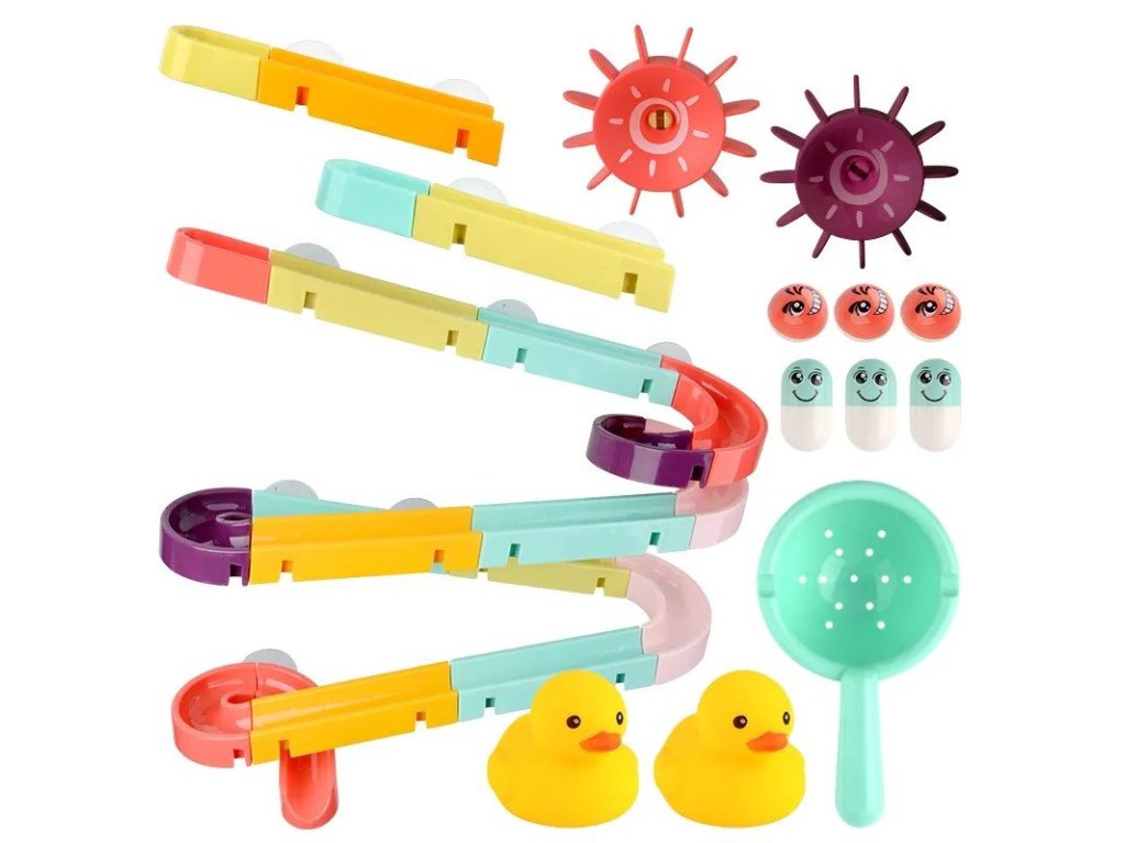 A készlet legfeljebb 44 darabot tartalmaz. A gumikacsa az egyik nélkülözhetetlen fürdőtárs. A tekercs megmutatja, mi történik a vízzel, miután megpörgeted, miközben a babok versenyeznek, hogy elsőként szabaduljanak meg a pályáról.