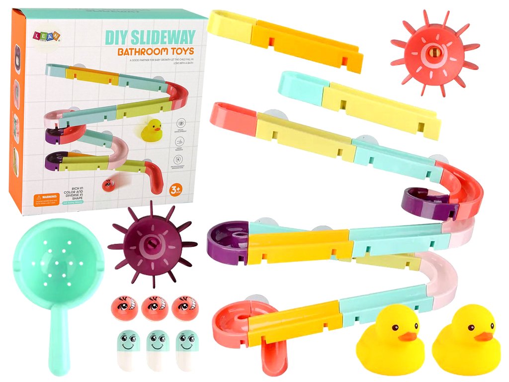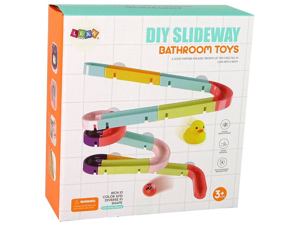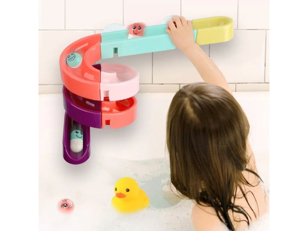 A csúszda műanyagból készült, és szilikon tapadókorongokkal rendelkezik, így a pályát a fürdőszobában a csempére lehet rögzíteni. Az élénk színek vonzzák és ösztönzik a játékot.