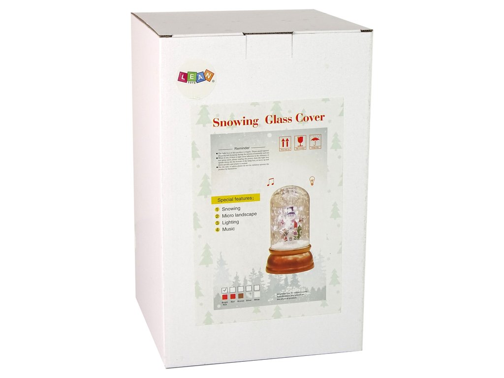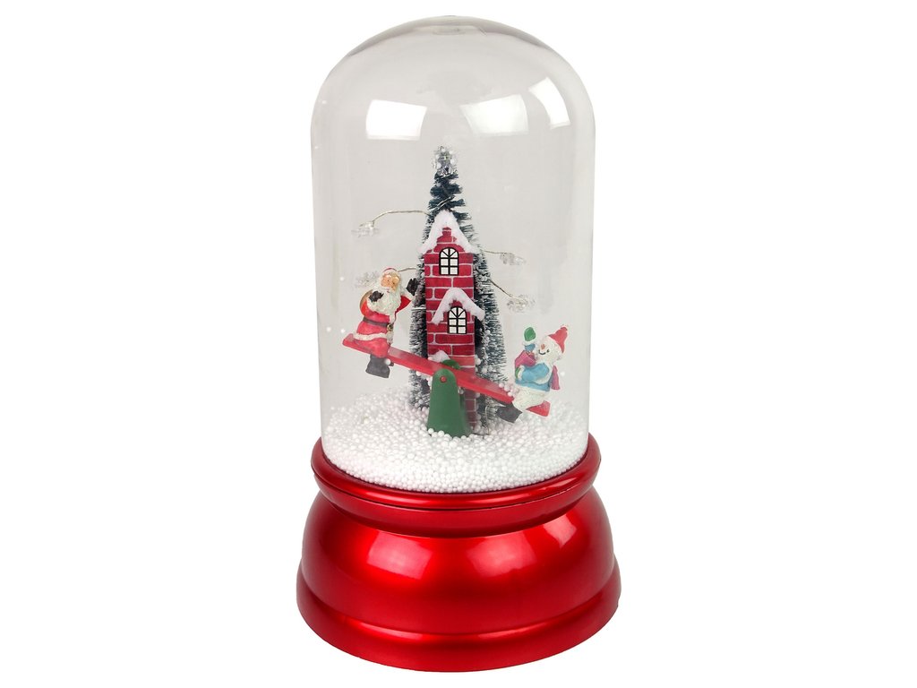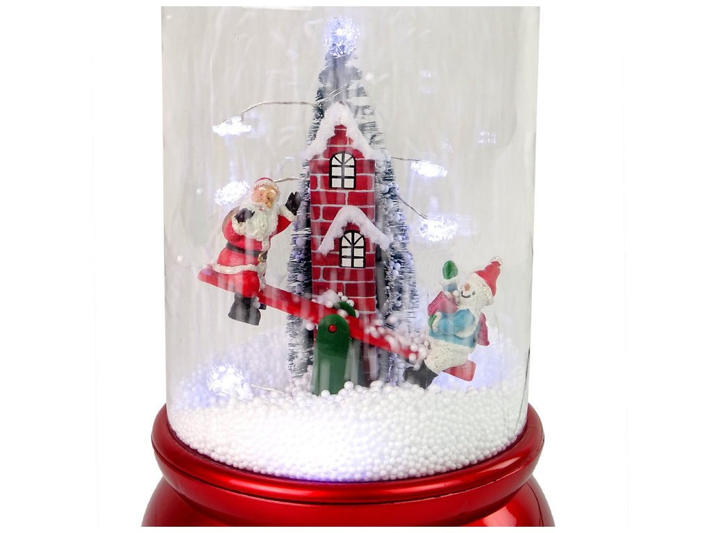 A dísz belsejében vidám Mikulás hóemberrel hintában, hátul magas téglakarácsonyfa és kémény, amelyből műhó kerül ki. Elköltözhetsz egy hóval és karácsonyi szimbólumokkal teli világba. A belsejében található szivattyú elszállítja a havat az alapról, és felülről szórja be, így hulló hó benyomását keltve.