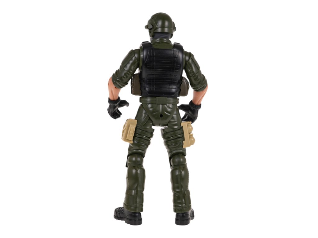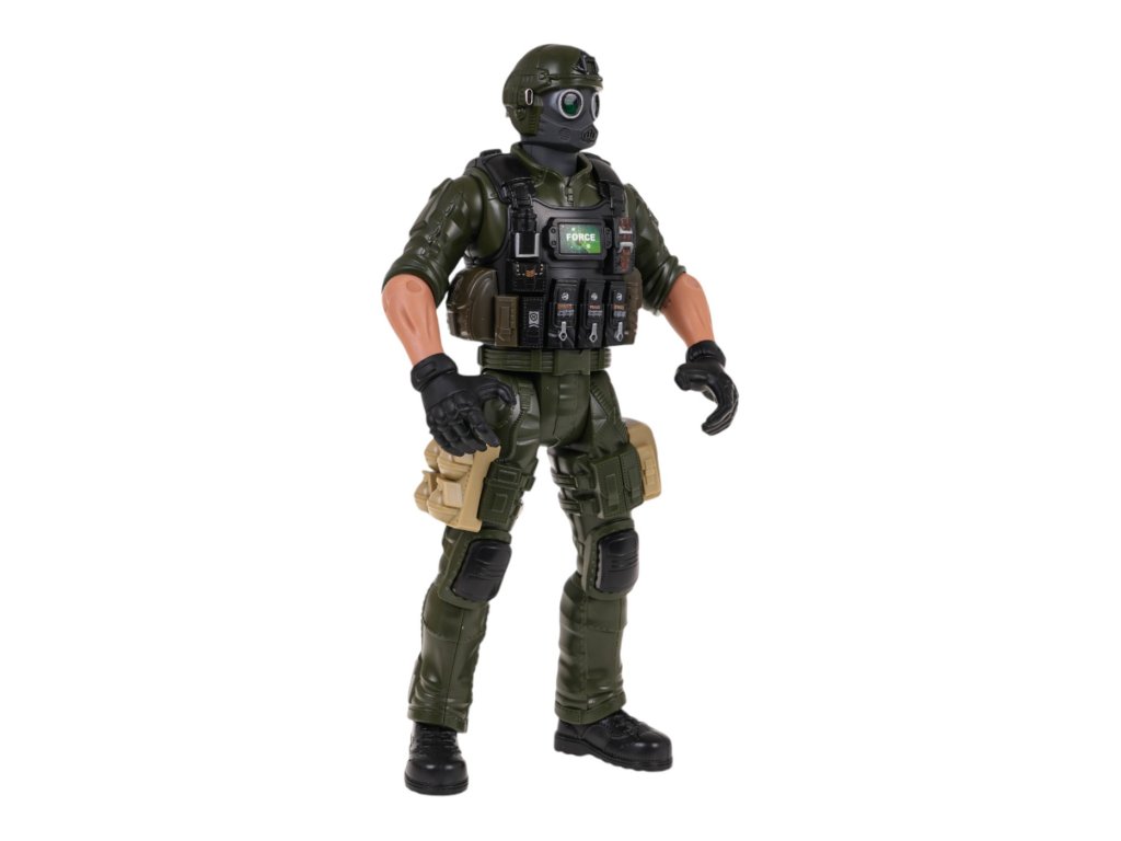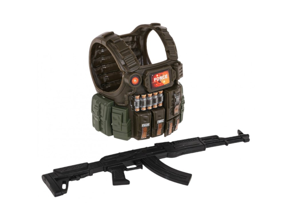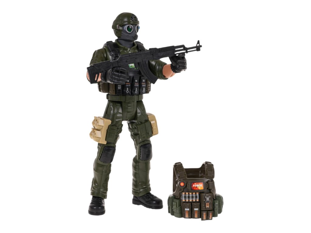 Katonafigura , fegyver és mellény gyerekeknek 3 éves kortól . A figurának mozgatható elemei vannak: lábak, karok, törzs és egy levehető, cserélhető mellény.