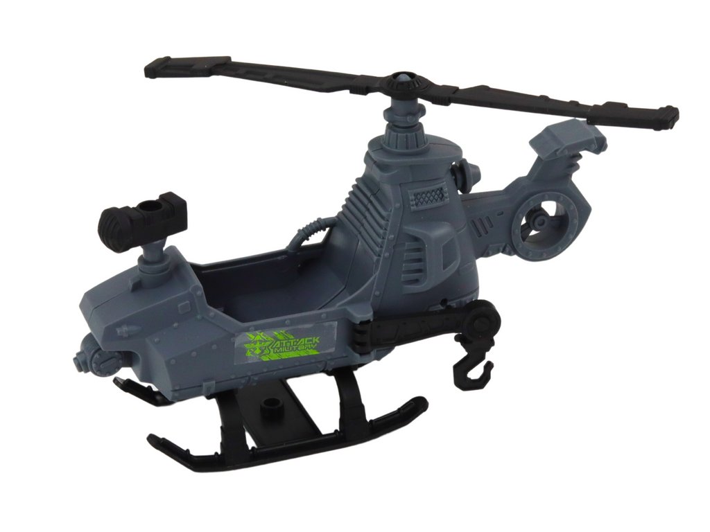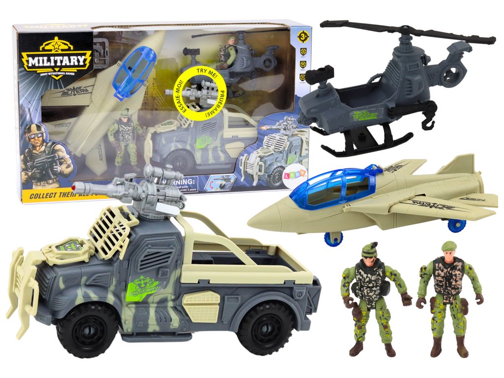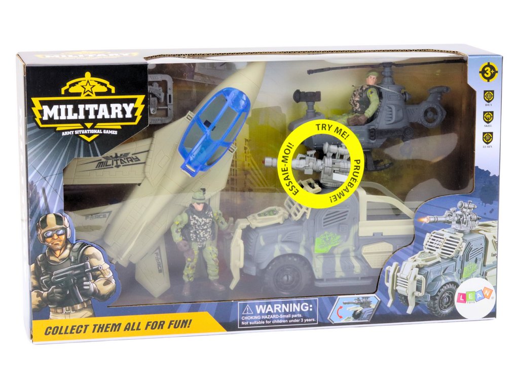 Katonai-harci készlet , amely órákig tart izgalmas szórakozást a gyerekeknek, és bevezeti őket a katonai kalandok világába! A készlet figurákat és katonai járműveket , egy helikoptert és egy vadászgépet tartalmaz, amely képes átrepülni a csatatéren, járőrözni a területen és csapatokat szállítani. Két részletes katonafigura, bevetésre készen a földön és a levegőben.