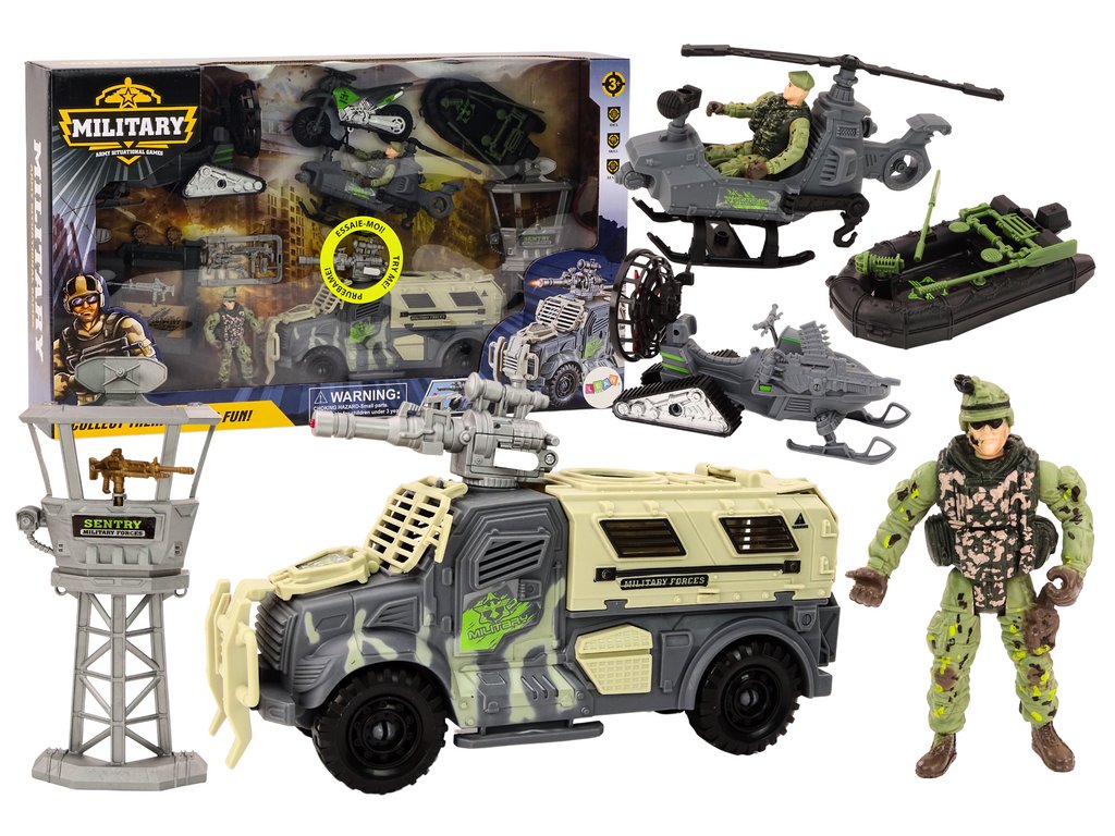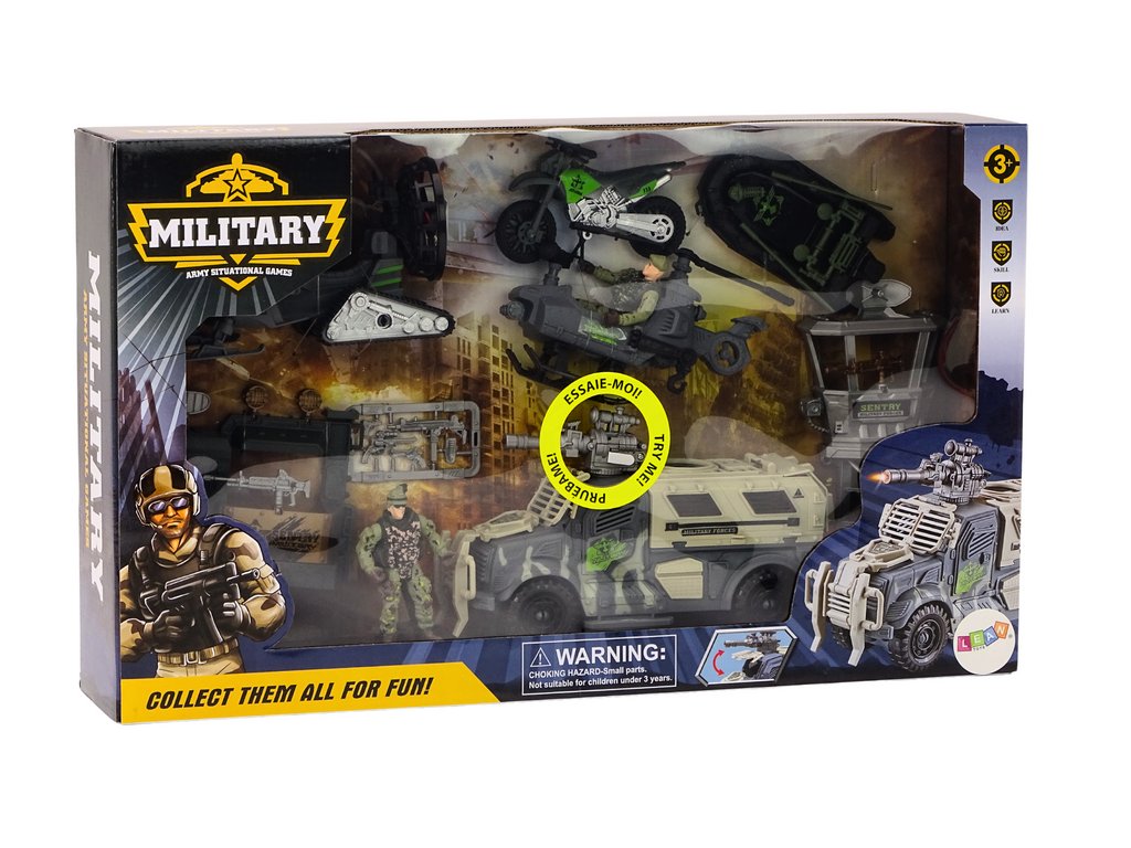 Egy katonai csatakészlet, amely sok órányi izgalmas szórakozást kínál a gyerekeknek, és elrepíti őket a katonai kalandok világába! A készlet tartalmaz figurákat és katonai járműveket, egy helikoptert, amely képes járőrözni a csatatéren, csapatokat szállítani és a terepet figyelni. Az irányítótorony kulcsfontosságú stratégiai elem, amelyből a teljes katonai műveletet át lehet látni. Felfújható csónak a vízen való gyors mozgáshoz, ideális mentési műveletekhez és meglepetésszerű támadásokhoz. A lánctalpas robogó egy agilis jármű a nehéz terepen való mozgáshoz, a kiváló mobilitást biztosító lánctalpakkal felszerelt. Két részletes katonafigura, bevetésre készen szárazföldön, vízen és levegőben. Terepmotorkerékpár a gyors mozgáshoz a csatatéren, ideális felderítéshez és gyors támadásokhoz. Egy impozáns harci jármű, amely a készlet központi eleme. Tetején egy ágyú hang- és fényeffektusokkal, amelyek valósághűbbé teszik az egyes csatákat.