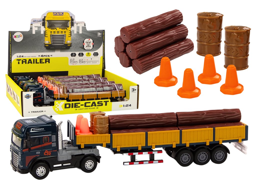 Az 1:24 méretarányú pótkocsis teherautó egy sokoldalú és valósághű játék, amely egyesíti a funkcionalitást a valódi jármű pontos ábrázolásával. A kék fülkével, a levehető oldalsó barna pótkocsival, a meghajtással, a levehető pótkocsival, valamint a hang- és fényeffektusokkal a gyerekek fejleszthetik képzelőerejüket, elsajátíthatják a logisztika és a közlekedésbiztonság alapelveit. A kúpok, hordók és rönkök formájában megjelenő terhelések tovább növelik a játék vonzerejét és oktatási értékét.