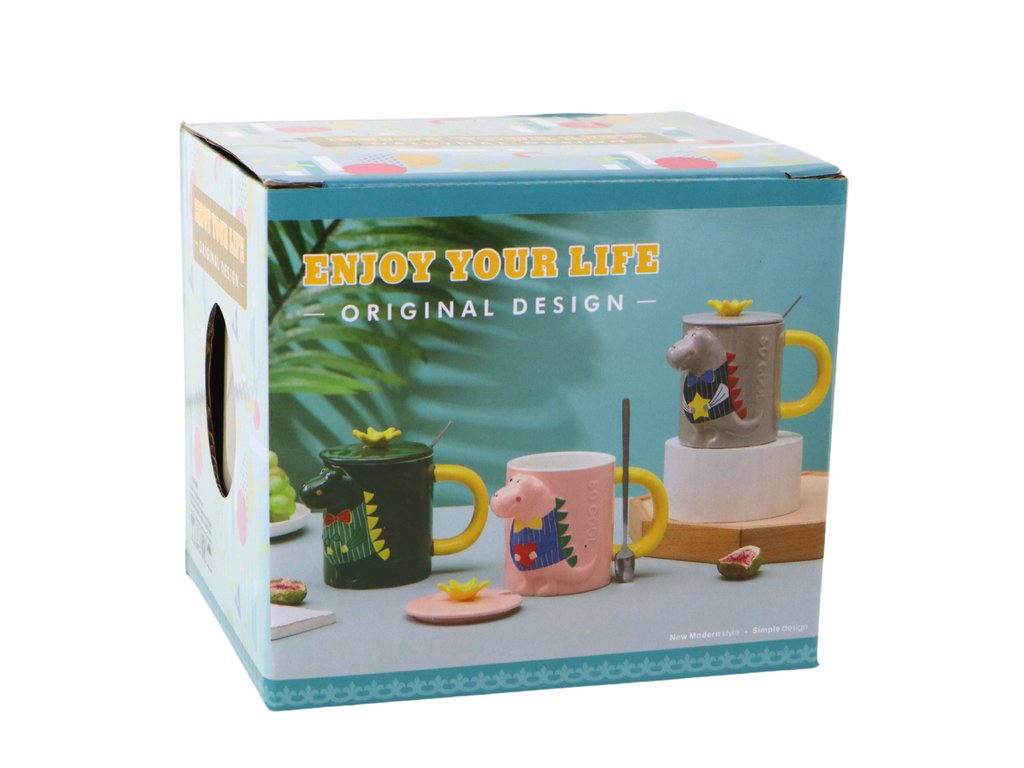 Egy bögre szokatlan, háromdimenziós dinoszaurusz motívummal, amely dombornyomással van a felületén. A dinoszaurusz különböző színekbe öltözött, ami szórakoztató és esztétikus elemet kölcsönöz.