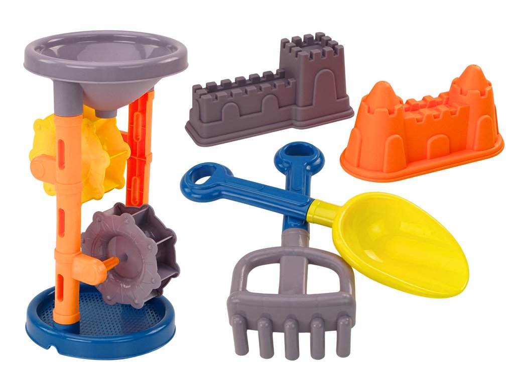 A készlet a darálón kívül tartalmaz egy lapátot, egy gereblyét és két kastély alakú formát. A lapát és a gereblye ideális a homok ásásához, válogatásához és formázásához, lehetővé téve sokféle szerkezet és homokművészet létrehozását. A kastélyformák egy fantázia elemet adnak a játékhoz, és lehetővé teszik a gyerekeknek, hogy saját homokvárat alkossanak, saját birodalmukat létrehozva a tengerparton vagy a homokozóban.