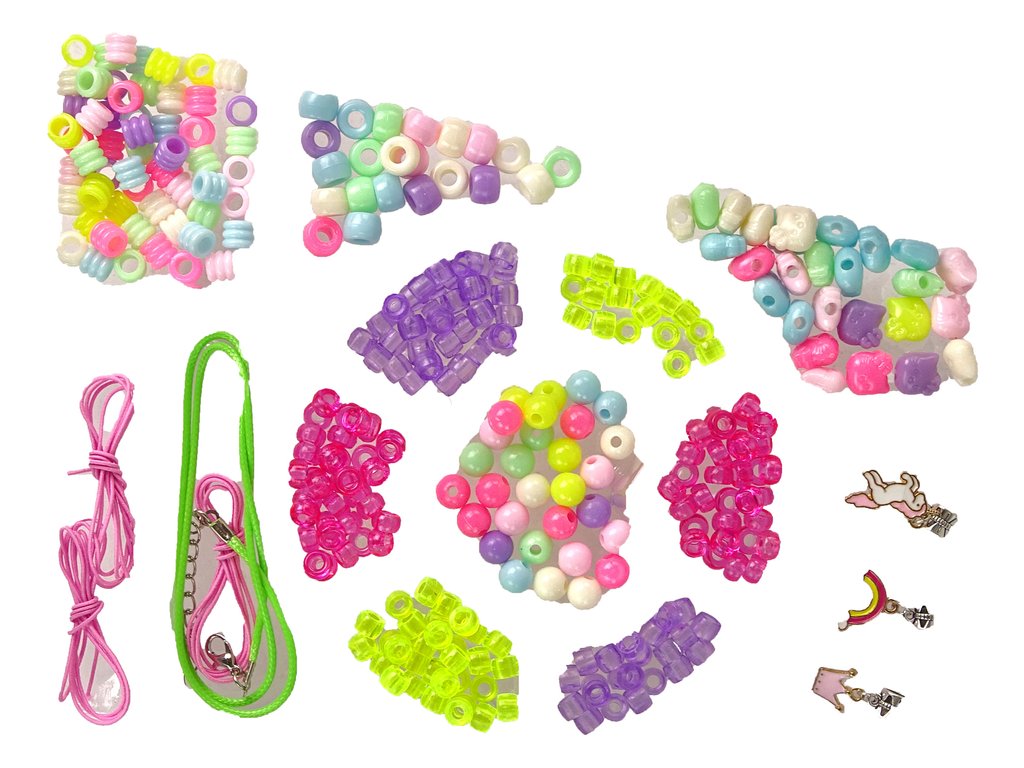 És ez még nem minden! Különféle formájú színes gyöngyöket, három rózsaszín szálat, zöld pántot és három különböző medált is tartalmaz, amelyek segítségével személyre szabott karkötőket és nyakláncokat készíthet.