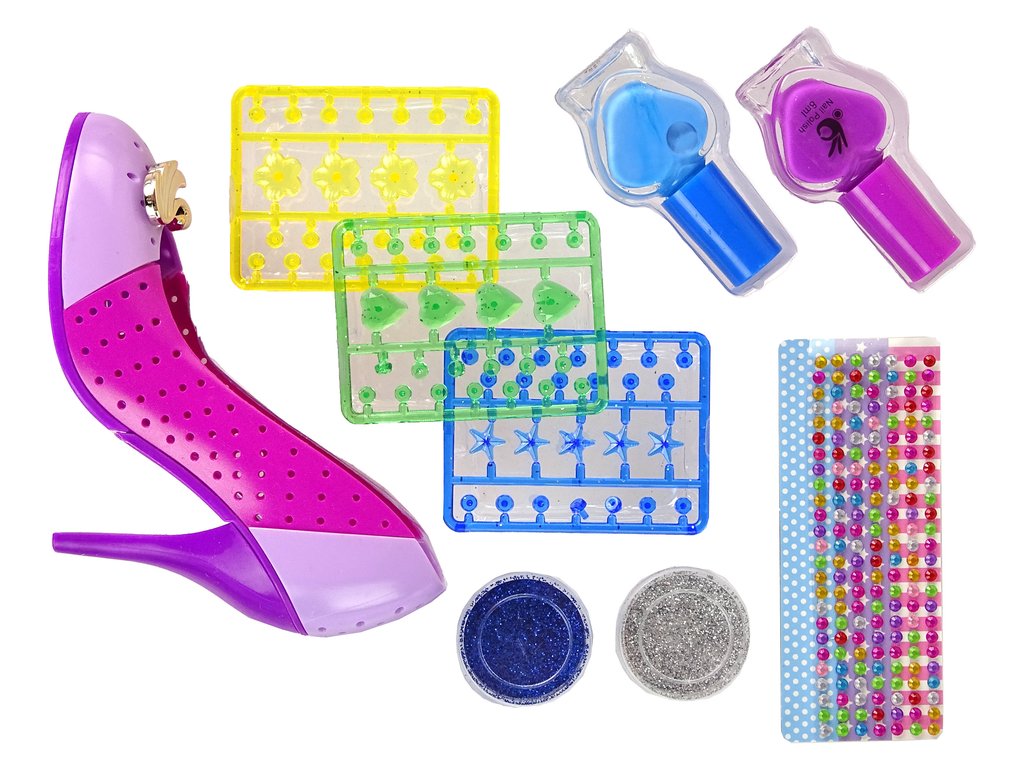 A készlet sztárja egy aranyos műanyag cipő, amely a kreativitás vásznává válik. A műanyag gyöngyök rögzítése nagyszerű szórakozás. Két különböző csillámkészlet csillogást és varázslatot varázsol projektjeibe. Cipőre vagy más elemekre szórhatja őket, hogy csillogást keltsenek.