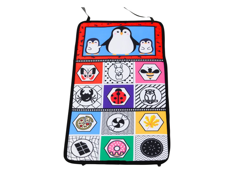 A kétoldalas, tükörrel és kontrasztos mintákkal ellátott babaszőnyeg igazi kincs a fejlődő kisgyermek számára. Ennek a játéknak az egyedisége a sok lenyűgöző elemben rejlik, amelyek nemcsak szórakozást nyújtanak, hanem támogatják a gyermek teljes körű fejlődését.