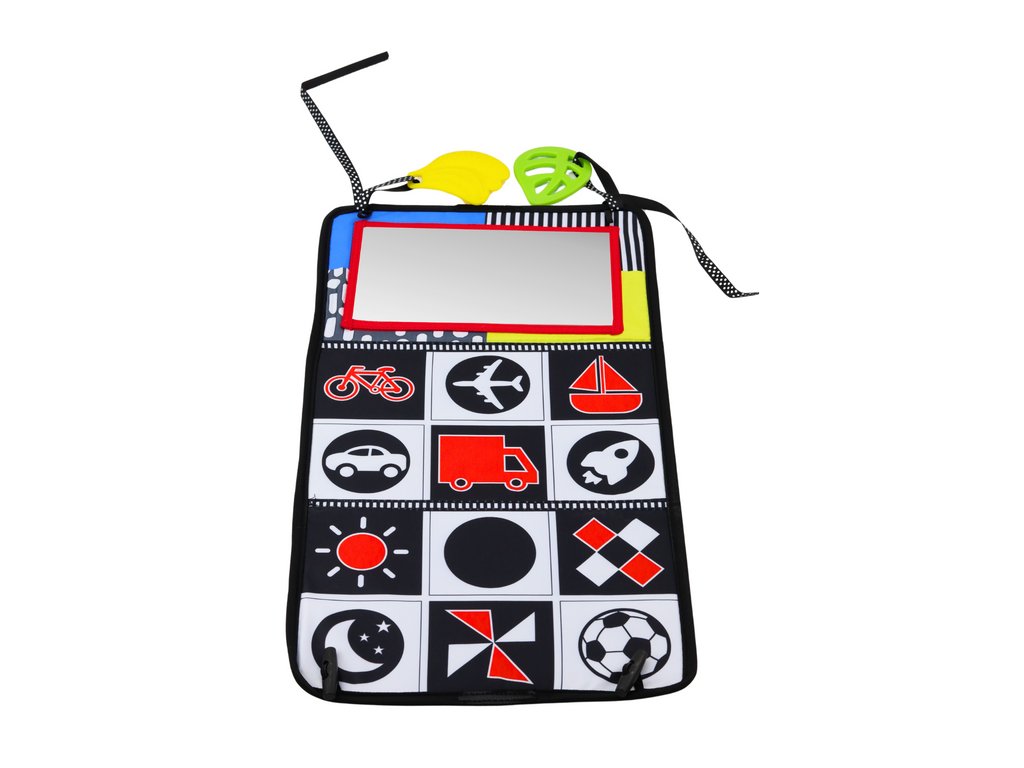 A szőnyegen állatok, járművek és minták színes képei vannak, amelyek nemcsak felkeltik a figyelmet, hanem a kontrasztokon keresztül a látás fejlődését is serkentik. A gyermeket lenyűgözi, ha megfigyeli ezeket a különböző mintákat, és megpróbálja felismerni őket. További jellemzők a szőnyegre erősített levél és banán alakú fogak , amelyek nemcsak tökéletes fogzási kiegészítők, hanem manipulációra és felfedezésre is ösztönöznek, így támogatják a baba motorikus és érzékszervi fejlődését. Nem szabad megfeledkeznünk a tükröről sem, amely magára vonja a gyermek figyelmét és felkelti az érdeklődést a körülötte lévő világ iránt.