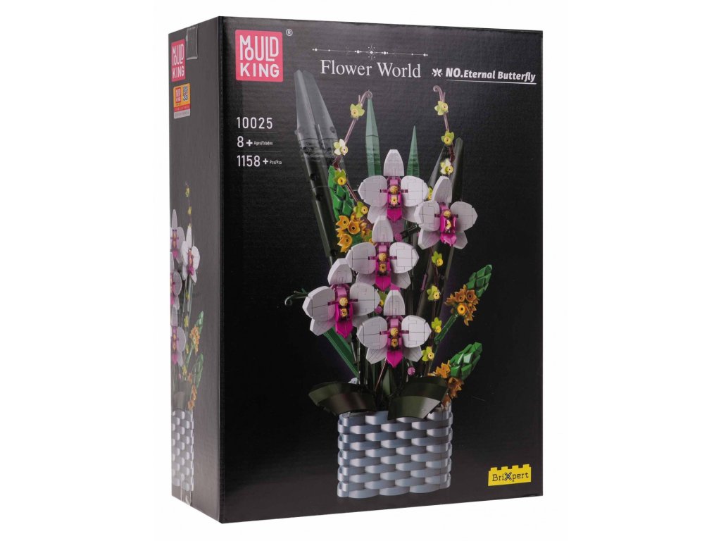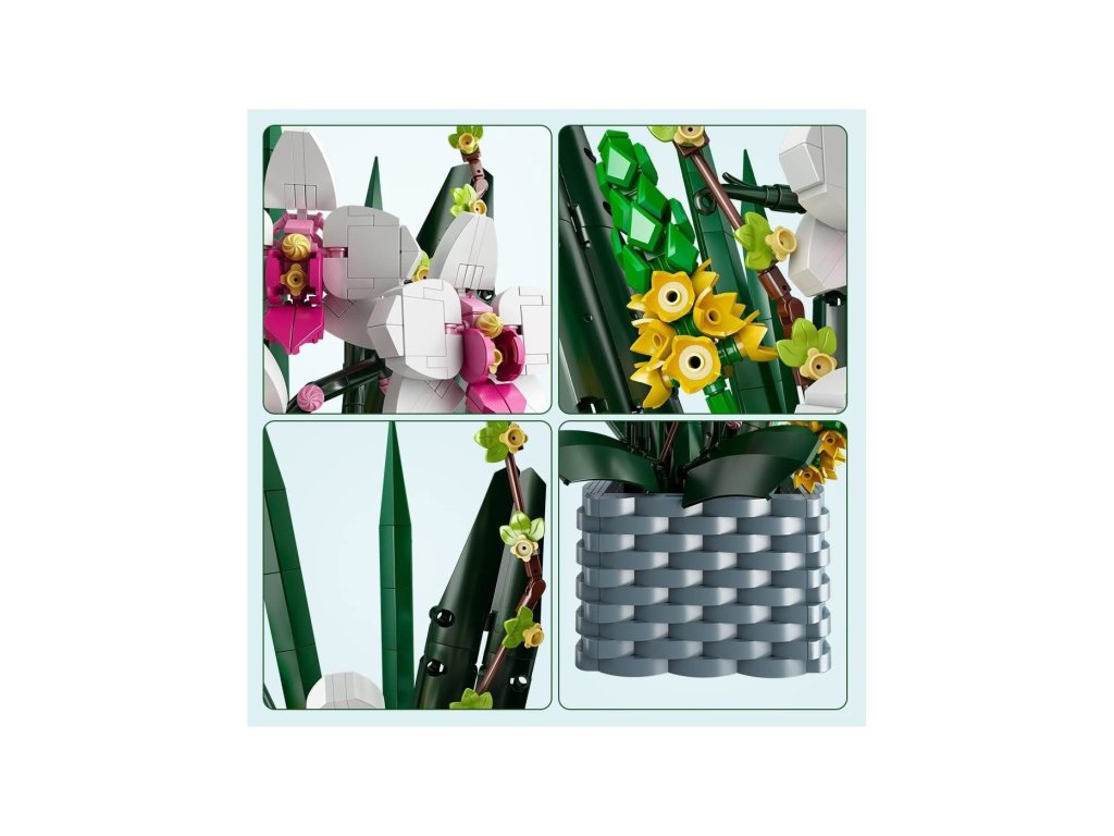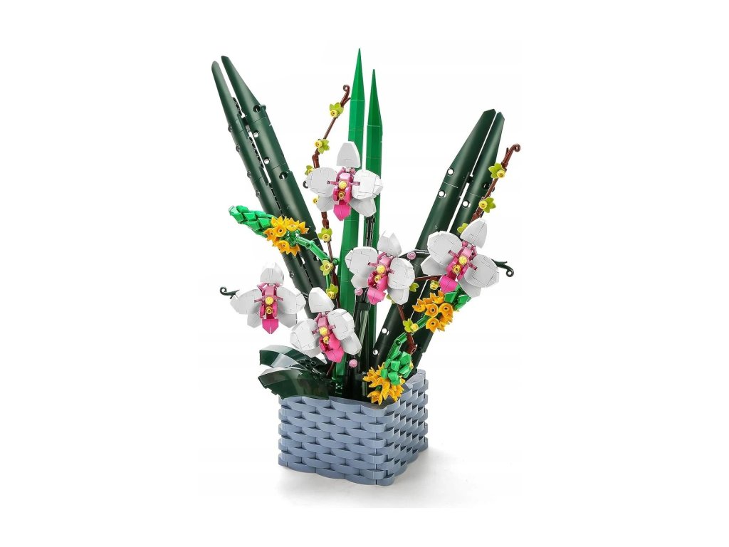 1158 darabos építőkocka készlet virágkötészeti virágcserép létrehozásához. A játék 8 évesnél idősebb gyermekek számára készült. A kockák és elemek kiváló minőségű műanyagból készülnek. A készlet valósághűen reprodukálja a valódi növények, például az orchideák formáit és színeit. Virágok, levelek és szárak elrendezésének lehetősége saját elképzelések szerint. Képes útmutató a készlet része. Az építőkockák egymásra rakása fejleszti a gyerekek kézügyességét, térbeli fantáziáját és türelmét.