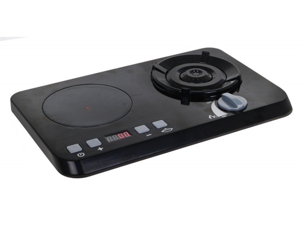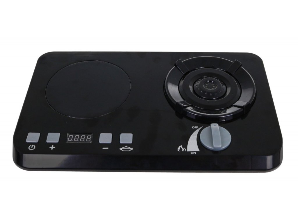 A bal oldalon egy megvilágított égő található főzési hangokkal és egy panel a főzési idő 2 percről 20 percre történő módosítására. A jobb oldalon egy megvilágított égő található sütési hangokkal és egy ON/OFF gombbal. A készlet élelmiszer-utánzatokat is tartalmaz.
